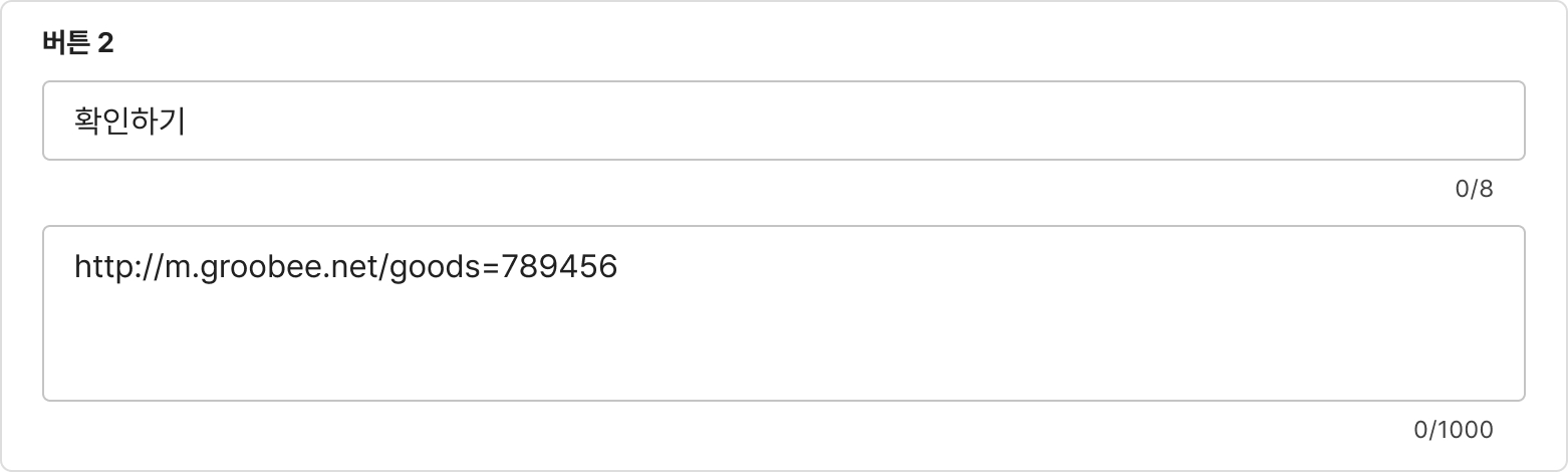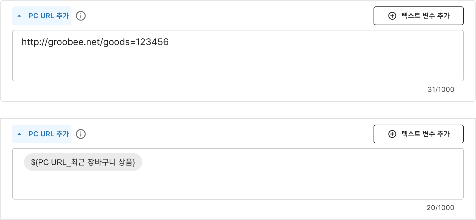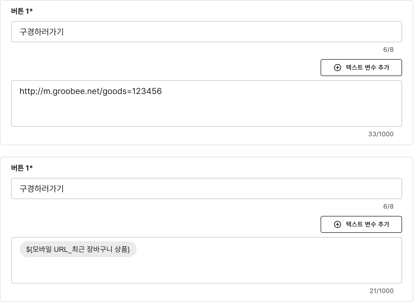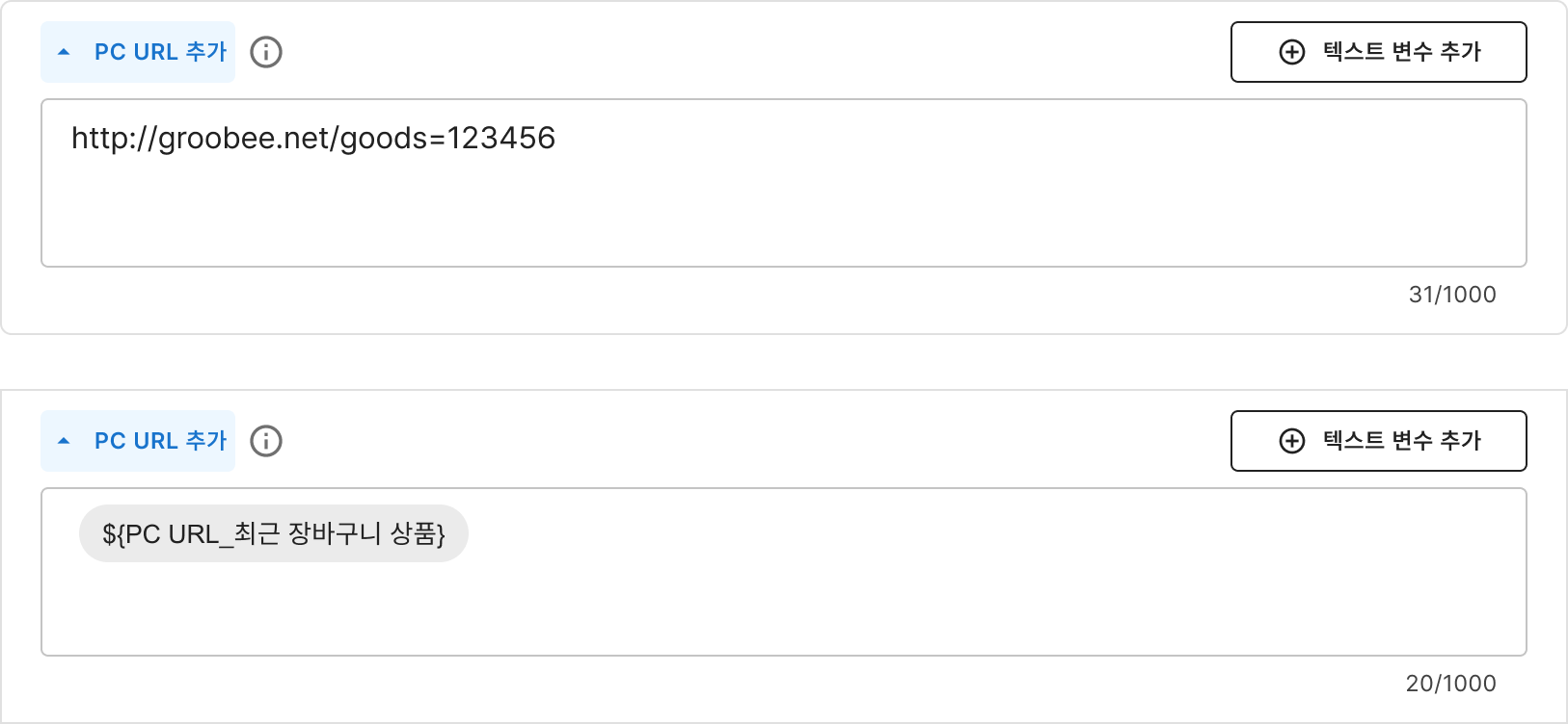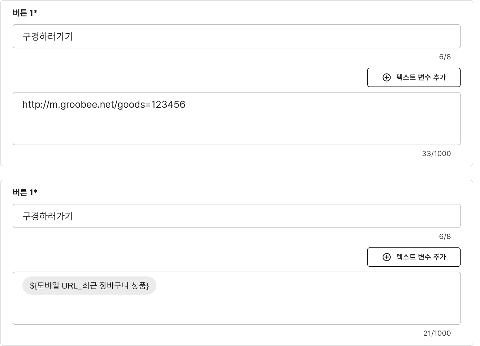 URL 관련 텍스트 변수는 한 메시지 안에서 같은 그루비 상품을 중복해서 사용할 수 없습니다.