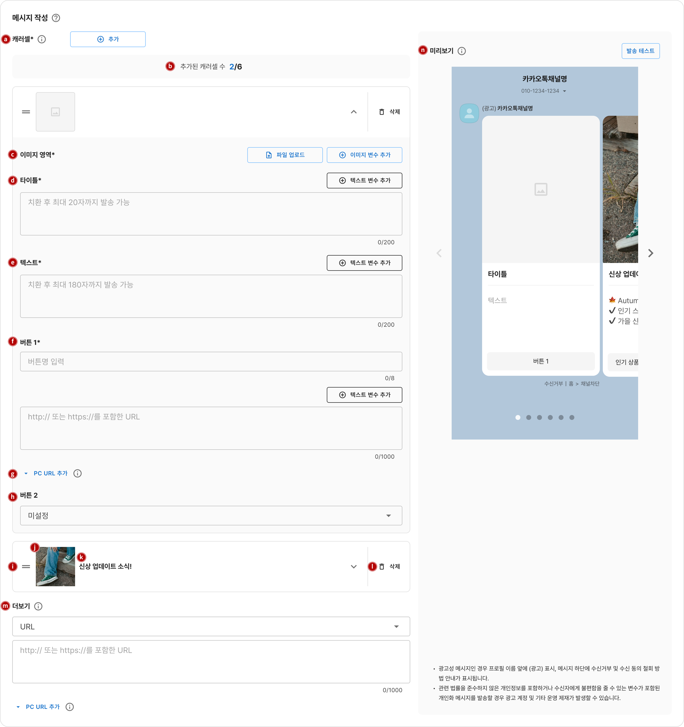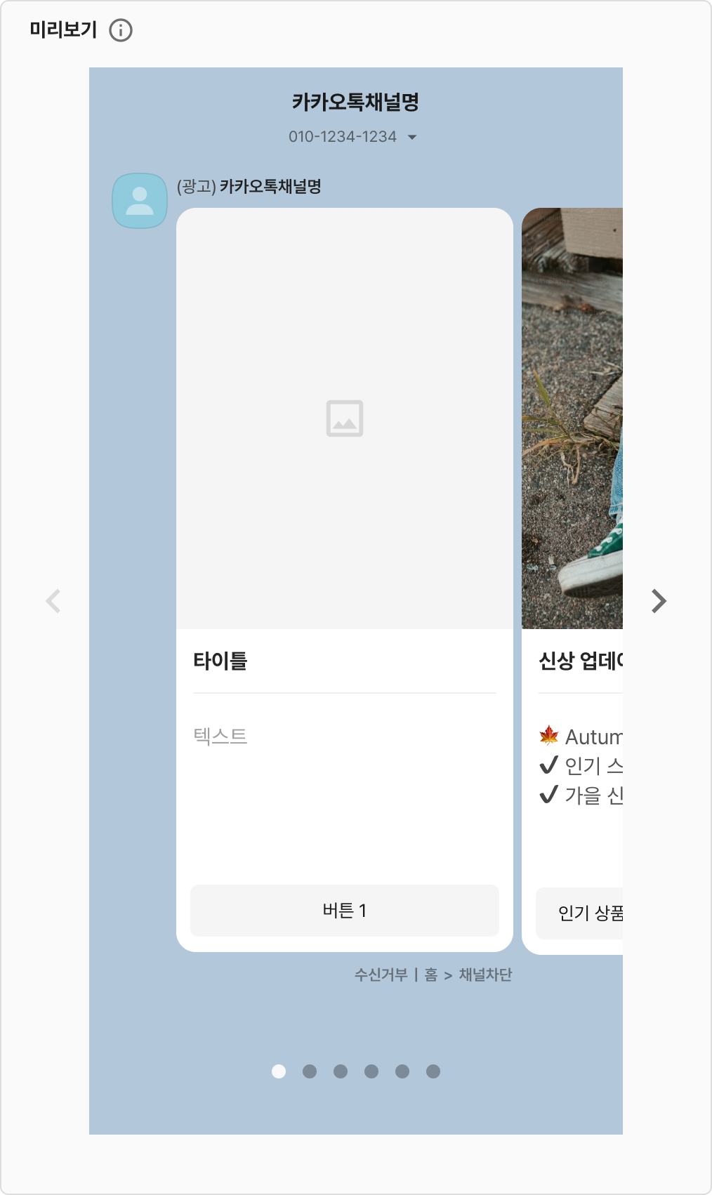 미리보기에서는 작성한 메시지 내용을 미리 확인할 수 있습니다. 캐러셀 옆에 화살표를 눌러 작성된 캐러셀 영역의 내용을 확인할 수 있습니다.