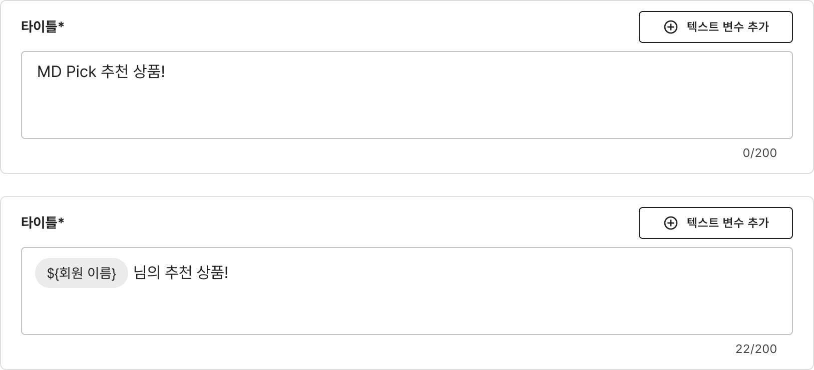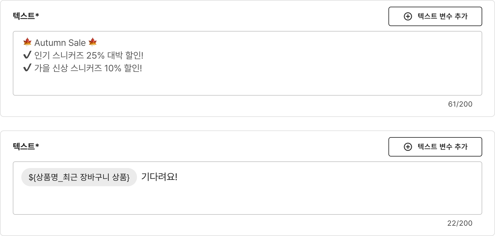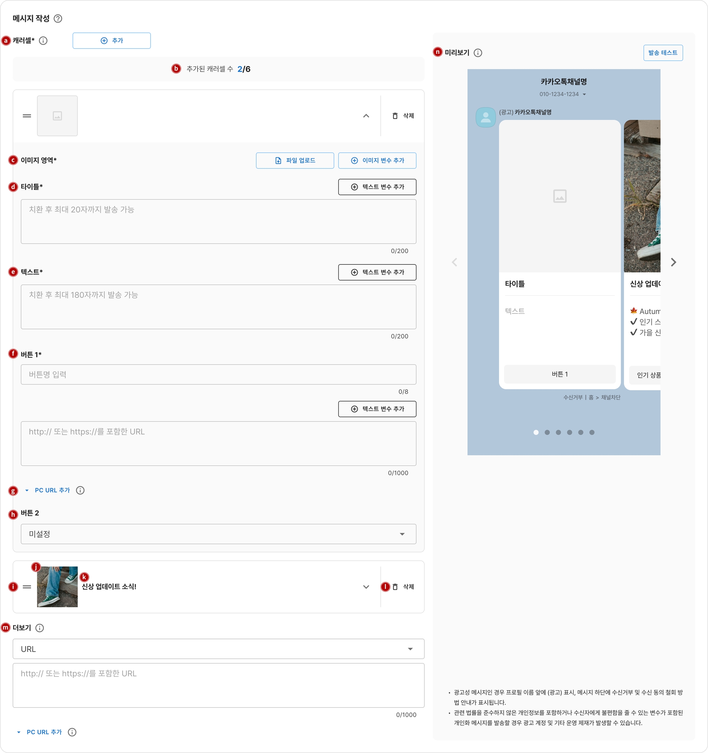 작성된 글자 수(고정 글자 수)나 (고정 글자 수+치환된 글자 수)가 초과됐을 경우 : 메시지 설정 가이드에서 각 영역별 최대 글자 수를 확인하여 작성 후 다시 시도해 주세요.