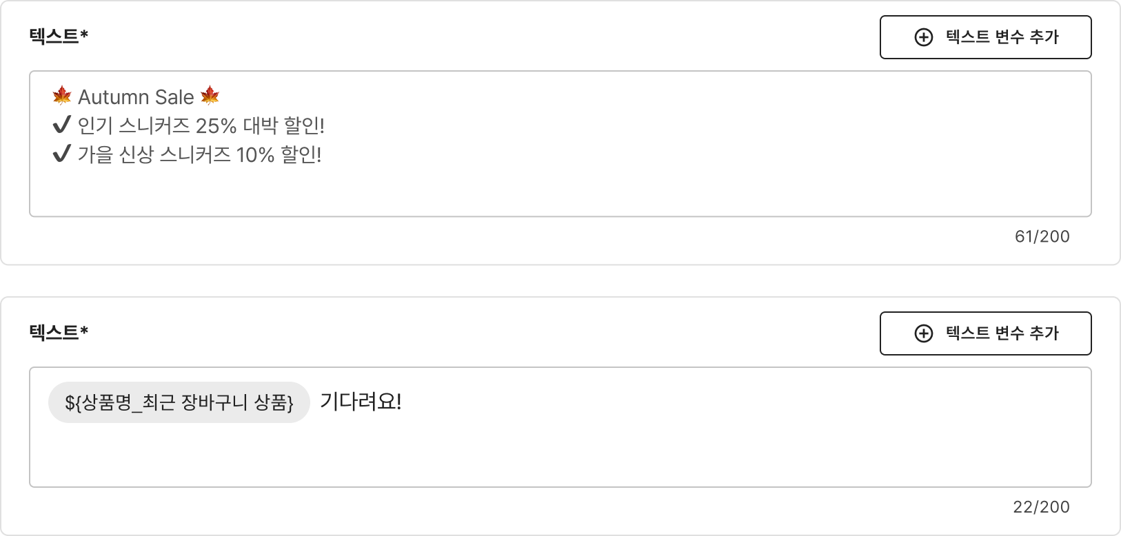 텍스트 변수 추가 : 회원별 개인화 추천 변수 내용을 담아 메시지를 발송합니다. 추가된 변수는 일반 텍스트와 구분되어 표시됩니다.