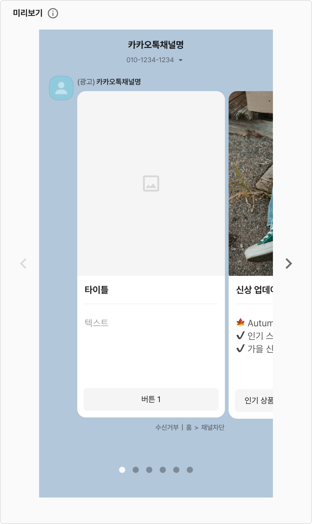 또한, 실제 발송될 메시지 본문을 작성하여 작성된 메시지를 미리보기와 발송 테스트를 통해 확인할 수 있습니다.