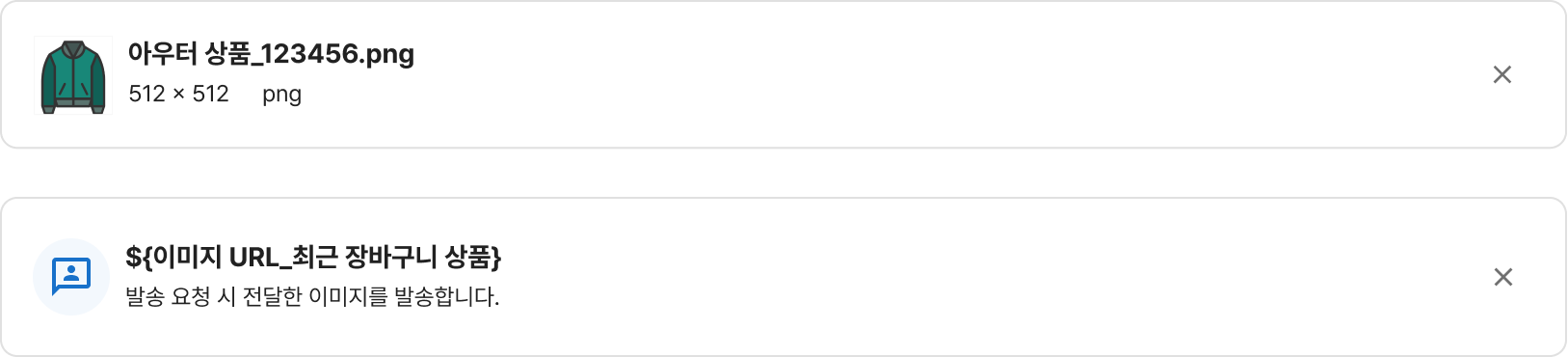업로드한 이미지가 썸네일로 표시됩니다. 개인화 변수 사용 시 대체 변수 이미지가 표시됩니다.
