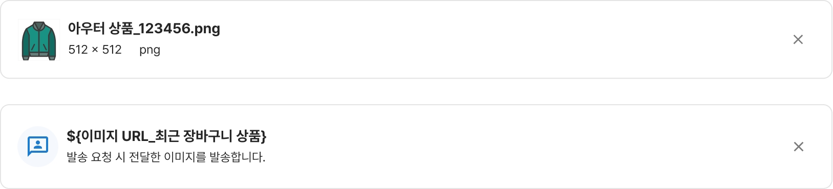 이미지는 수집된 이미지를 발송하기 때문에 이미지 사이즈와 비율에 제한이 있습니다. 이미지 URL 변수는 한 메시지 안에서 같은 그루비 상품을 중복해서 사용할 수 없습니다.