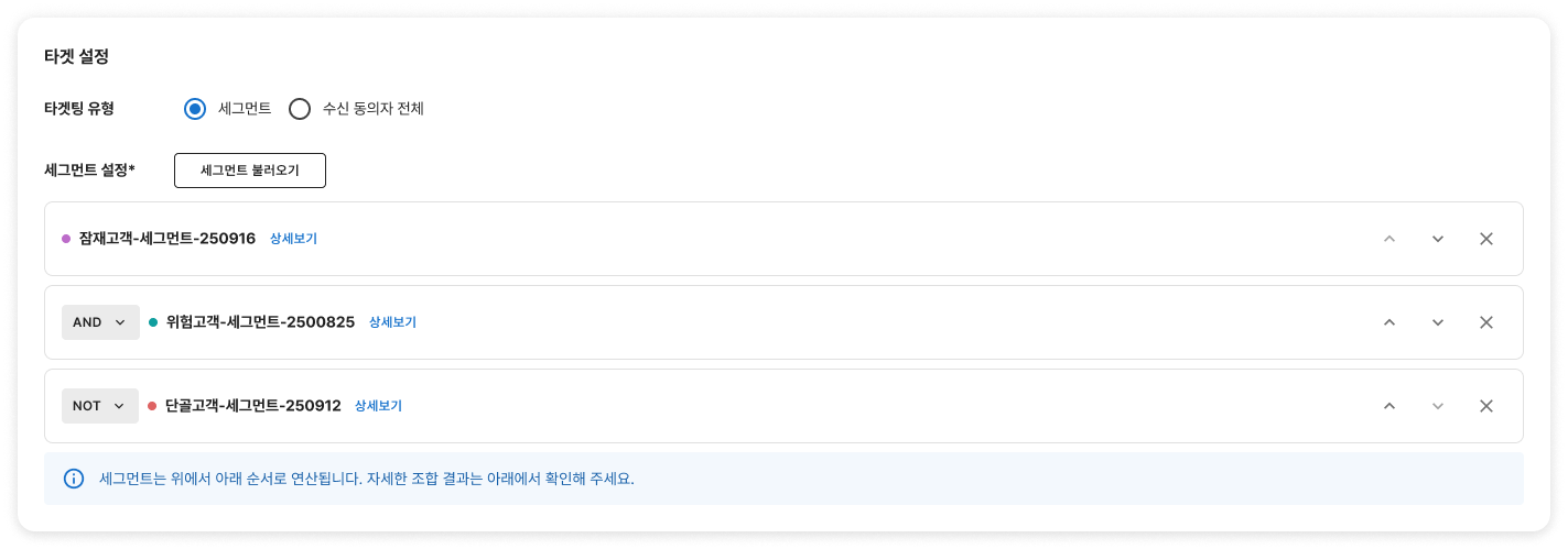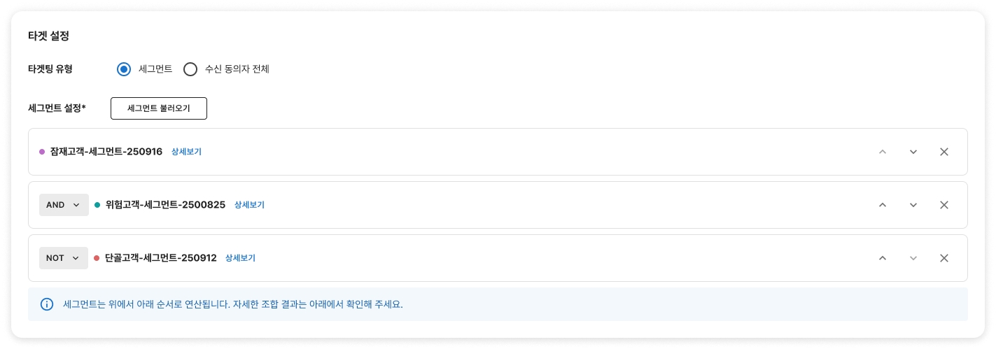 순서 조정 : 세그먼트는 위에서 아래 순서대로 조건이 조합됩니다. 세그먼트 좌측의 화살표 버튼을 통해 자유롭게 순서를 변경하고, 타겟 조합의 우선순위를 조정할 수 있습니다.