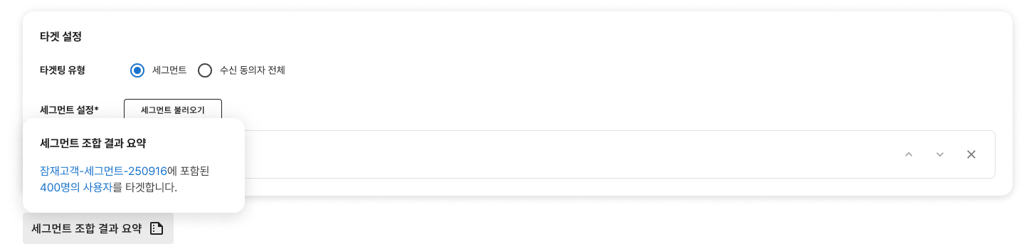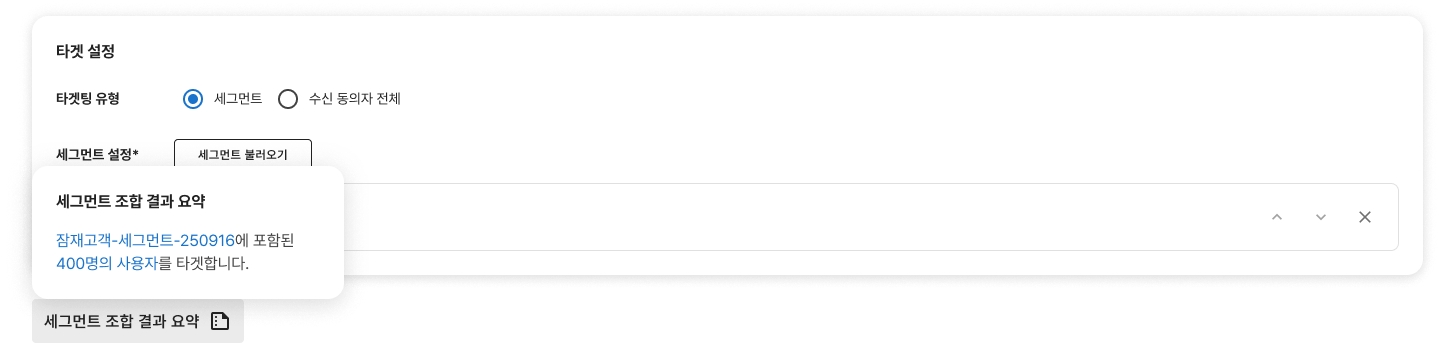 세그먼트 설정 : 타겟팅 유형이 세그먼트일 때 표시되며, 저장된 세그먼트를 불러올 수 있습니다.