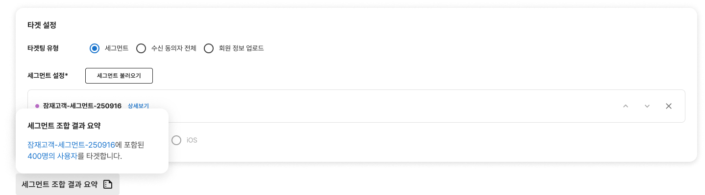 • 세그먼트 설정 : 타겟팅 유형이 세그먼트일 때 표시되며, 저장된 세그먼트를 불러올 수 있습니다. 상세보기를 클릭하여 해당 세그먼트의 상세 정보를 확인합니다.