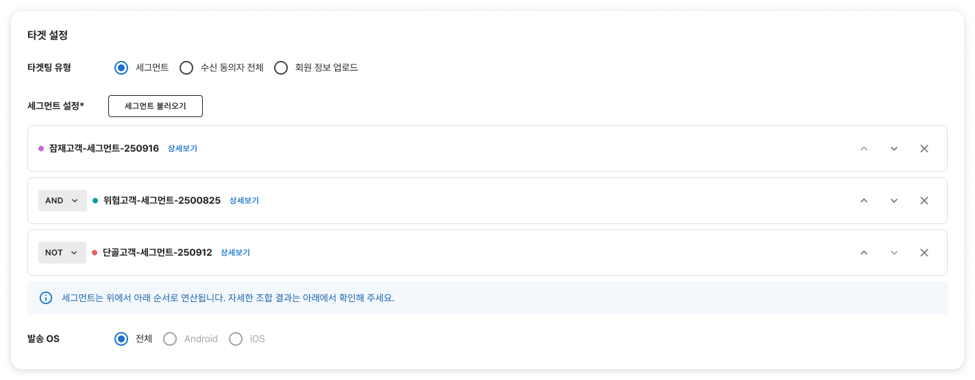 • OR : 앞선 조건과 현재 세그먼트의 합집합에 해당하는 타겟에게 발송합니다. (예: VIP 고객 이거나 최근 30일 내 구매 고객)