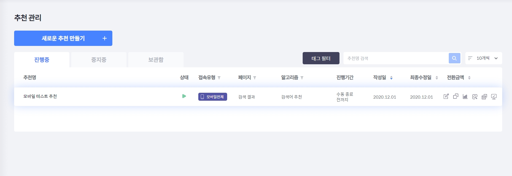 추천이 노출되기 위해서는 '상태'열의 아이콘을 클릭해 진행중 상태로 바꿔주어야 합니다. 생성한 추천이 진행중 탭에 있는지 확인해 주세요.