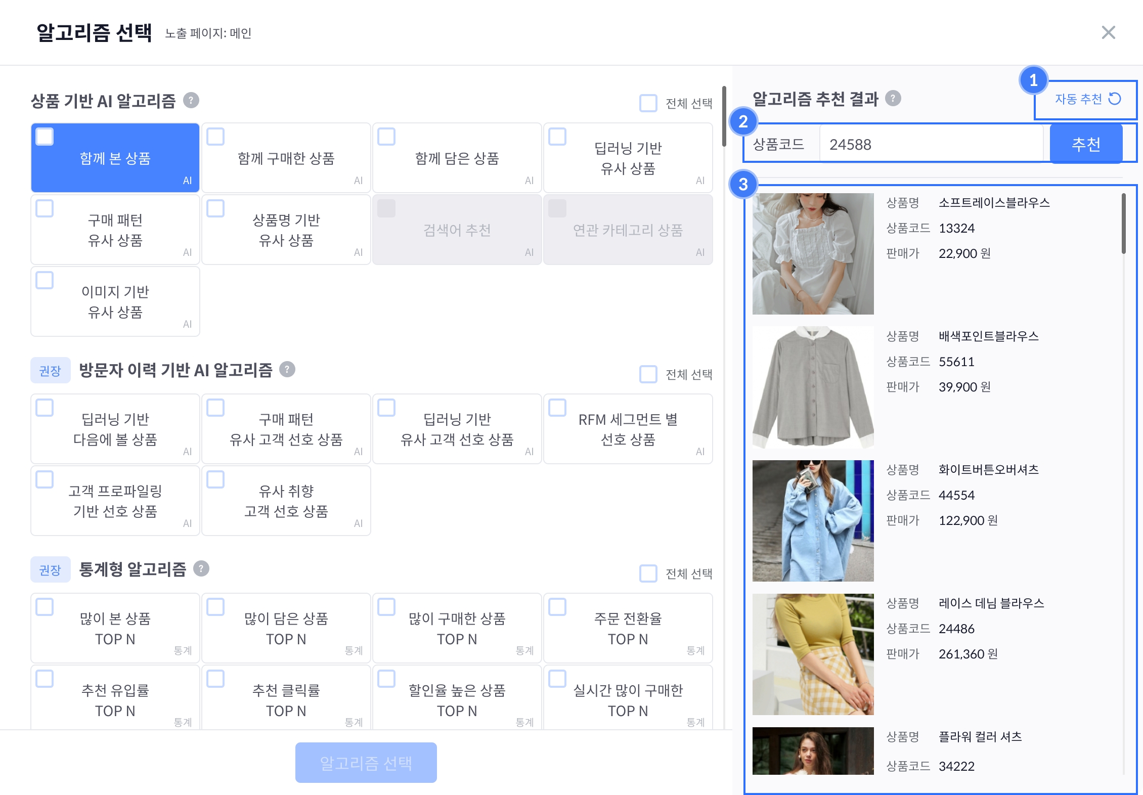 • 상품 추천 알고리즘과 기획전 추천 알고리즘은 함께 사용할 수 없습니다.