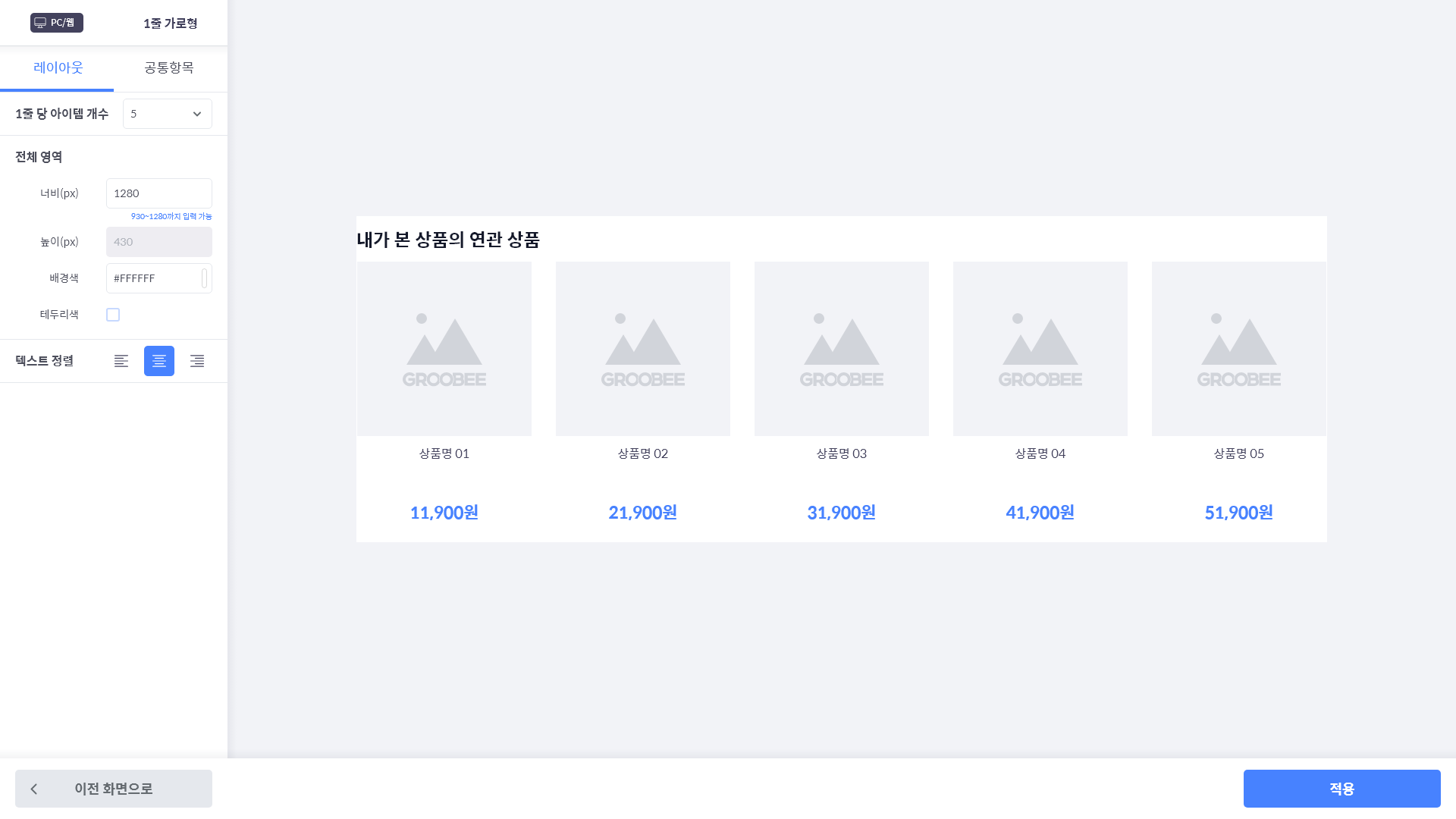 5. 텍스트 정렬: 상품명, 가격 텍스트의 정렬 방법을 지정할 수 있습니다.
