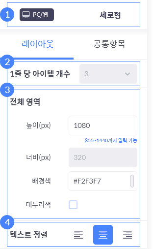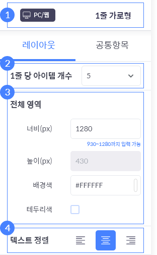2. 1줄 당 아이템 개수'에 따라 설정 가능한 전체 너비 범위가 달라집니다.