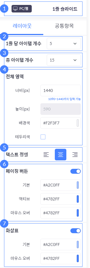 • 슬라이드 유형에서 표시되는 페이징 버튼의 사용 유무를 선택하고 각 상태별 색상을 지정할 수 있습니다.