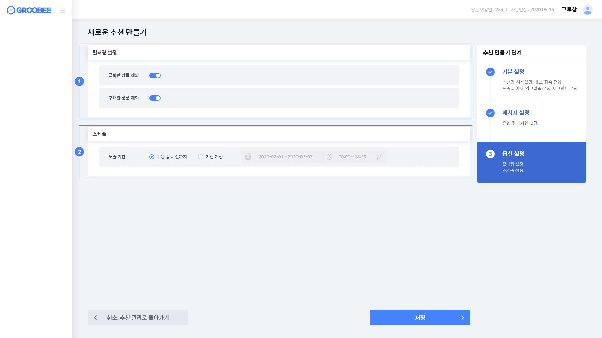 • '수동 종료 전까지'를 선택하면 추천 생성 시점부터 수동으로 추천을 종료할 때까지 테스트가 진행됩니다.