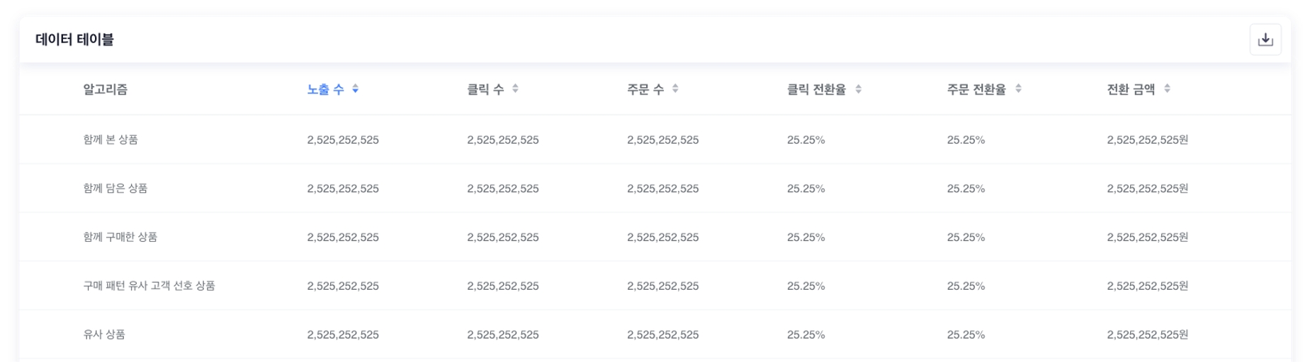 데이터 항목은 다음과 같습니다. 1) 노출 수 설정한 기간 내 알고리즘이 적용된 추천 SET 내 상품이 노출된 횟수입니다. 알고리즘 노출 수는 세션과 상관없이 해당 알고리즘이 적용된 추천 SET이 노출될 때마다 카운팅됩니다. 2) 클릭 수 설정한 기간 내 알고리즘이 적용된 추천 SET에서 상품이 클릭된 횟수입니다. 알고리즘 클릭 수는 세션과 상관없이 해당 알고리즘이 적용된 추천 SET에서 상품이 클릭될 때마다 카운팅됩니다. 3) 주문 수 설정한 기간 내 알고리즘이 적용된 추천 SET에서 상품을 클릭하고, 같은 세션 내에서 해당 상품이 주문된 횟수입니다. 4) 클릭 전환율 클릭 수 / 노출 수 * 100 5) 주문 전환율 주문 수 / 노출 수 * 100 6) 전환 금액 설정한 기간 내 추천 SET에서 상품을 클릭하고, 같은 세션 내에서 해당 상품이 주문된 금액의 합계입니다.