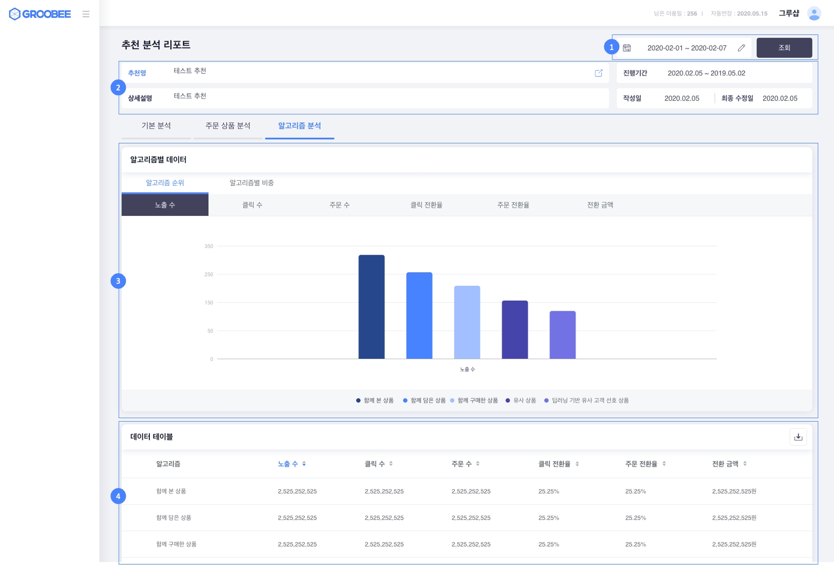 선택한 추천 생성 시 설정한 알고리즘의 성과 데이터를 확인할 수 있습니다.