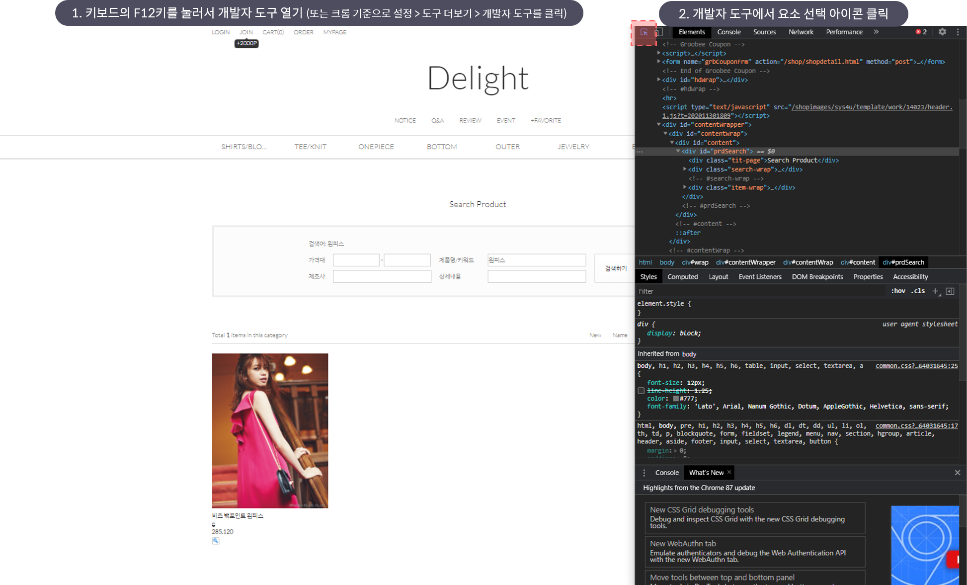 쇼핑몰 상품 검색 화면에서 키보드의 F12키를 눌러서 개발자 도구를 엽니다. (설정에 따라 창이 흰색으로 표시될 수 있습니다.) *또는 크롬 기준으로 설정 > 도구 더보기 > 개발자 도구를 클릭합니다.