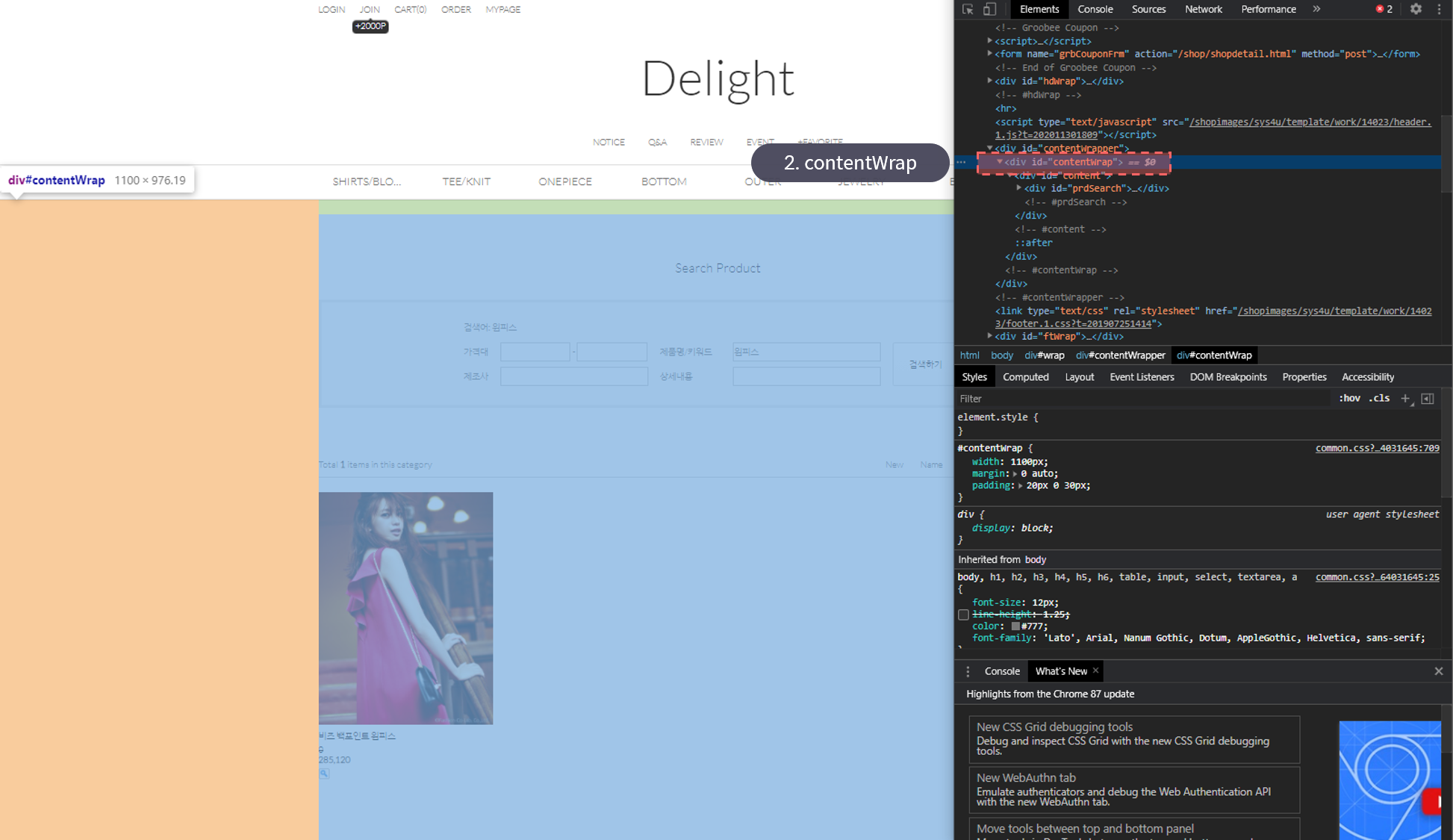 content 영역을 확인합니다. 추천을 이 영역 안에 삽입하기 위해 영역의 너비(1100 px)를 확인합니다.