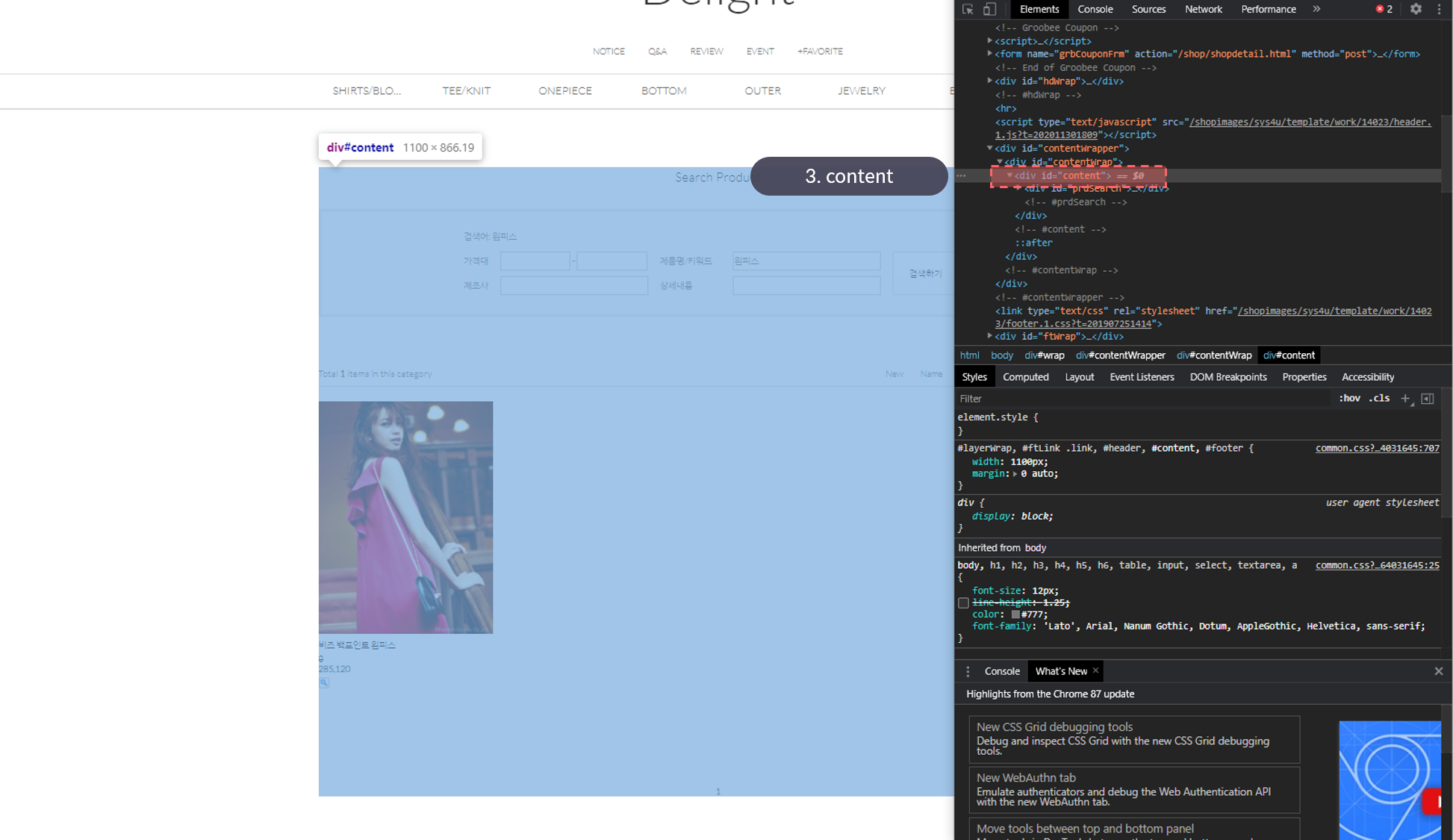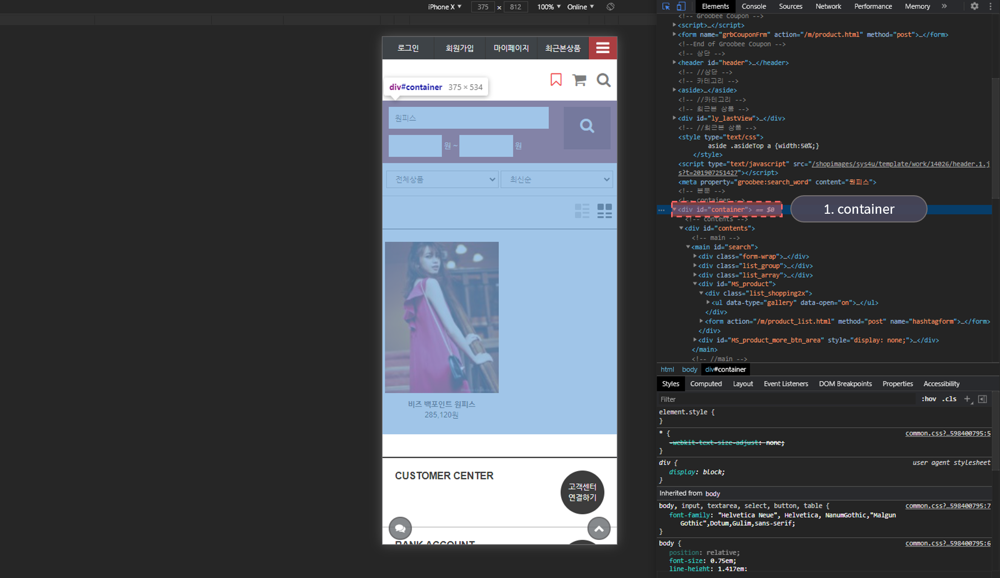 상품 검색 결과 화의 소스 코드에서 확인한 영역들의 id를 확인합니다.