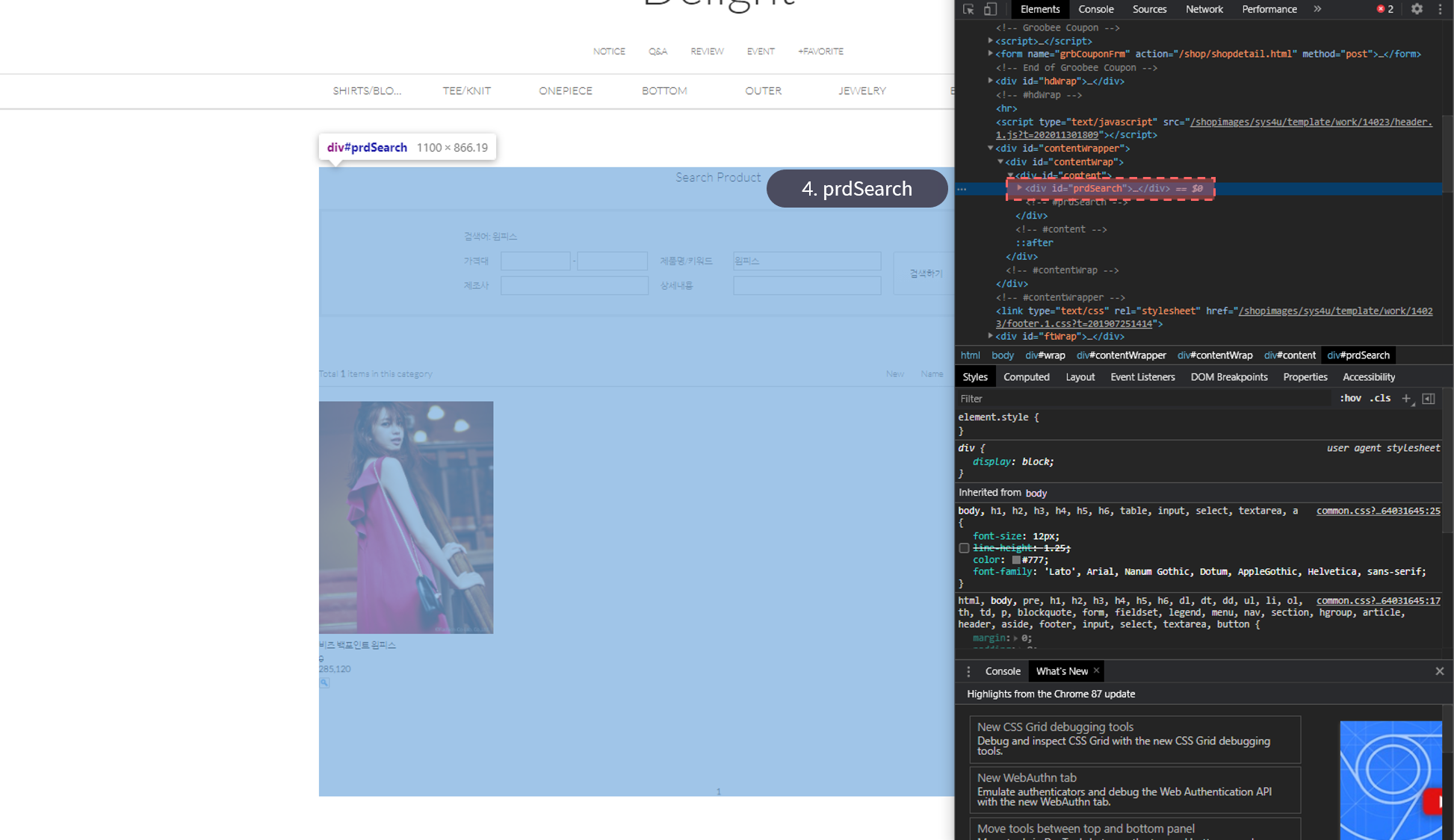 prdSearch 영역을 확인합니다. 추천을 이 영역의 하단에 삽입할 것이므로 div id(prdSearch)를 기억합니다.