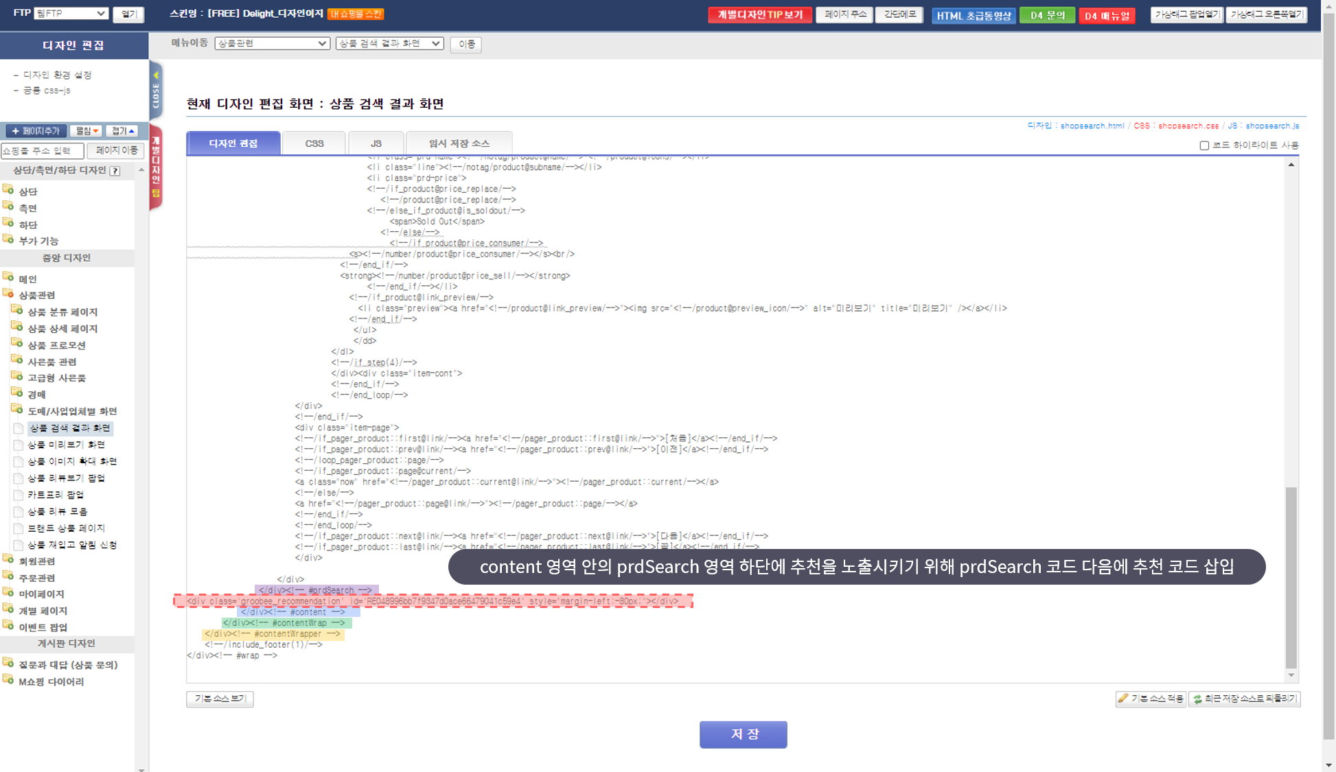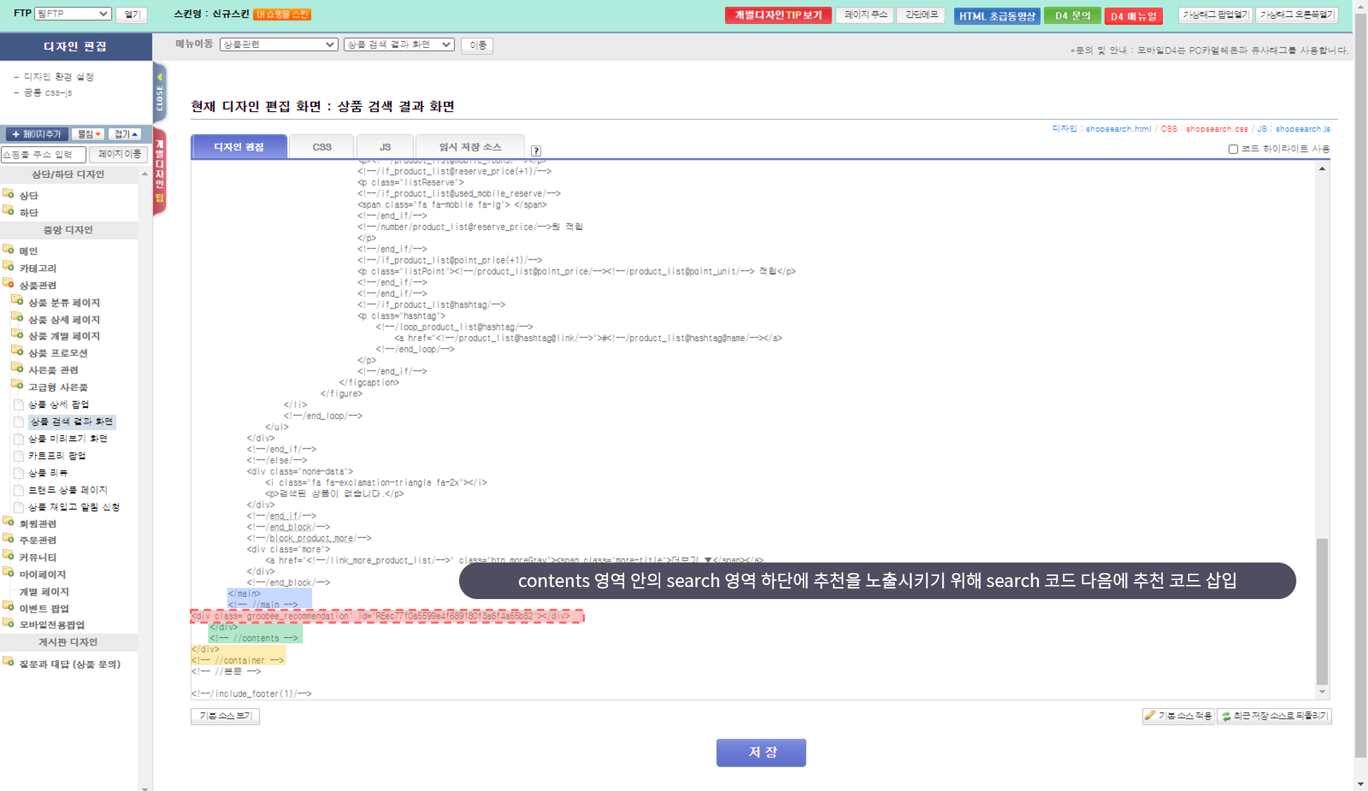 content 영역 안의 prdSearch 영역 하단에 추천을 노출시키기 위해 prdSearch 코드 다음에 추천 코드를 삽입하고 저장합니다.