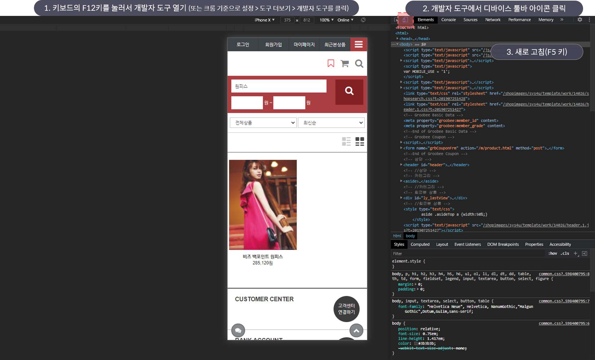 새로 고침(F5 키)를 누르면 PC에서 모바일 화면을 확인할 수 있습니다.