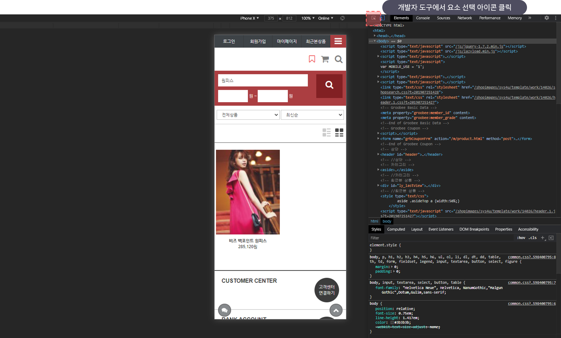 개발자 도구에서 요소 선택 아이콘을 클릭합니다.
