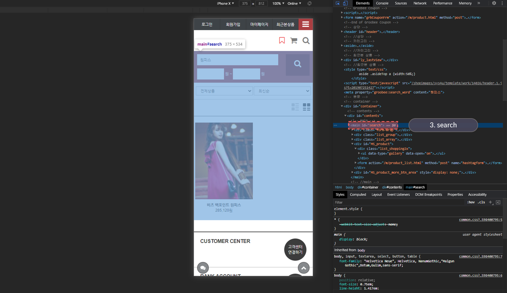 search 영역을 확인합니다. 추천을 이 영역의 하단에 삽입할 것이므로 main id(search)를 기억합니다.