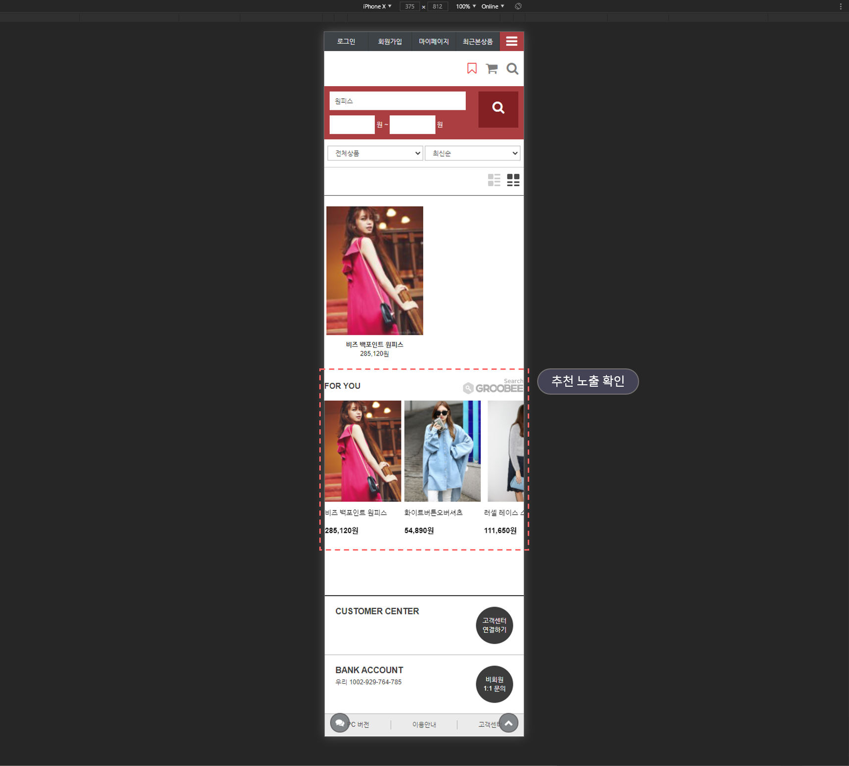 쇼핑몰 상품 검색 결과 화면에서 추천 적용 결과를 확인합니다.