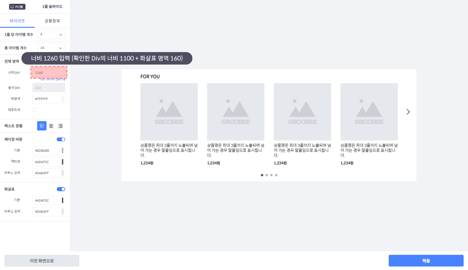 화살표 영역을 고려한 추천 너비 설정에 대한 내용은 추천 에디터 디자인 가이드를 확인해 주세요.