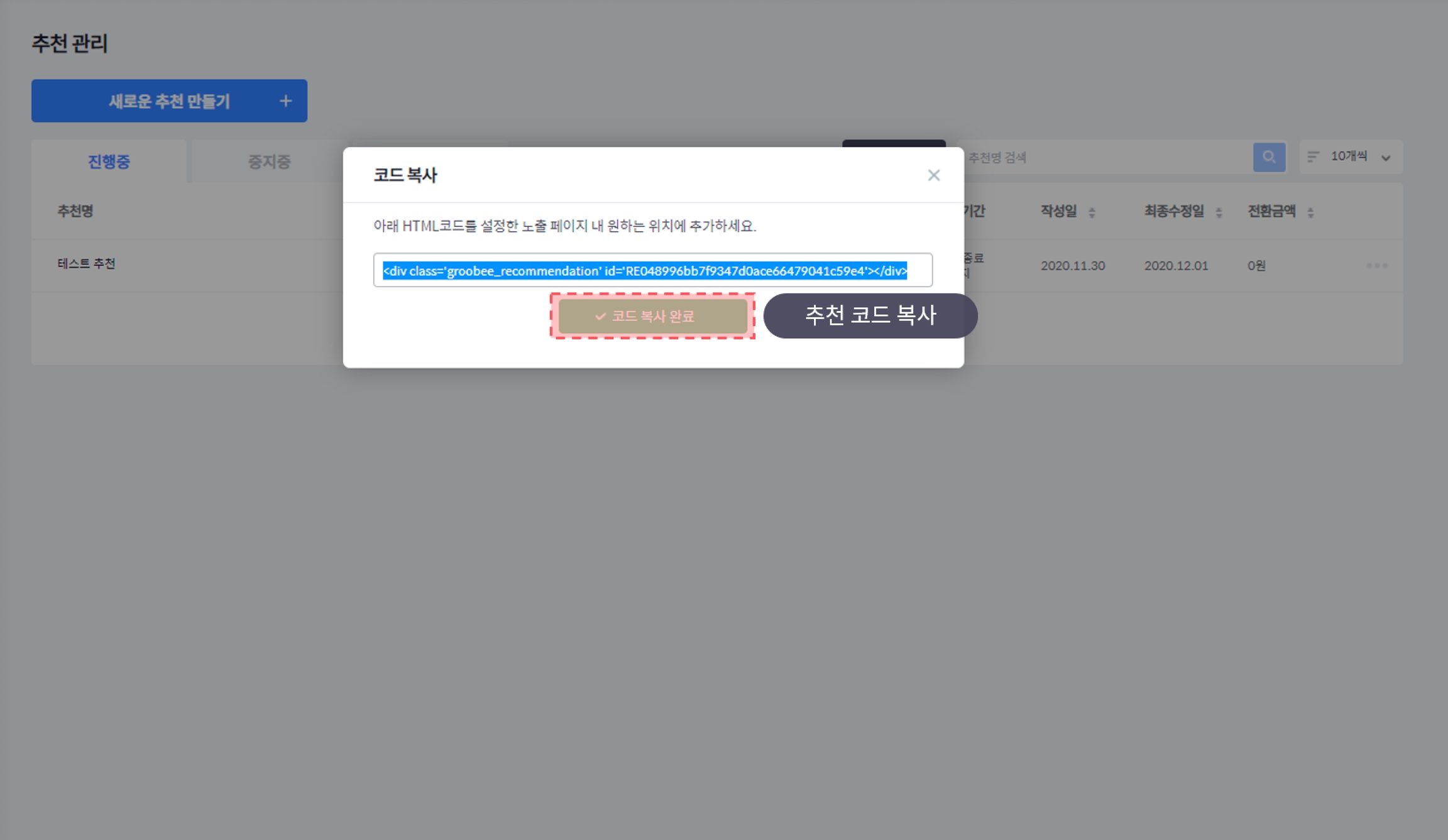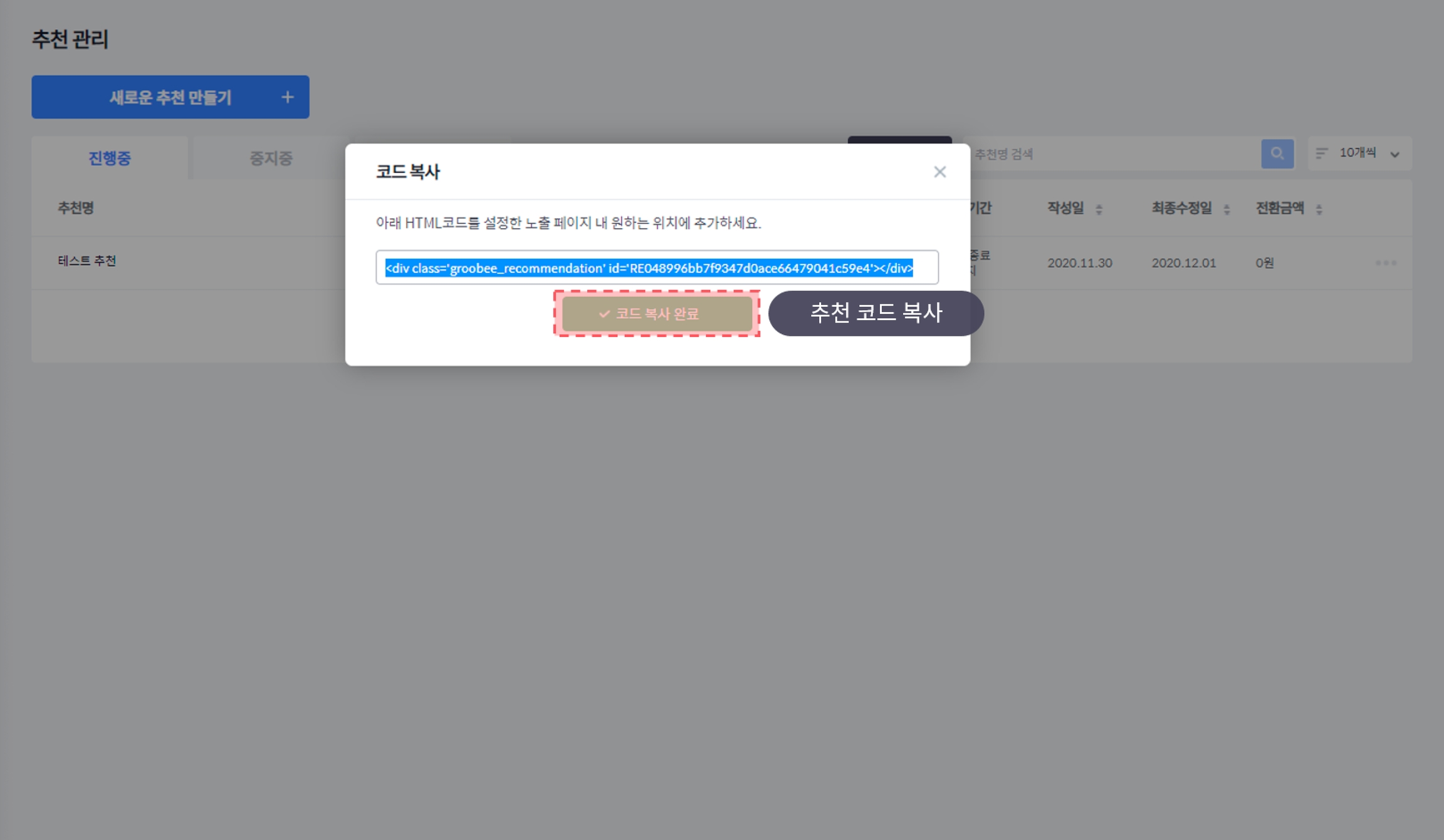 추천 코드 복사 방법은 새로운 추천 만들기를 확인해 주세요.