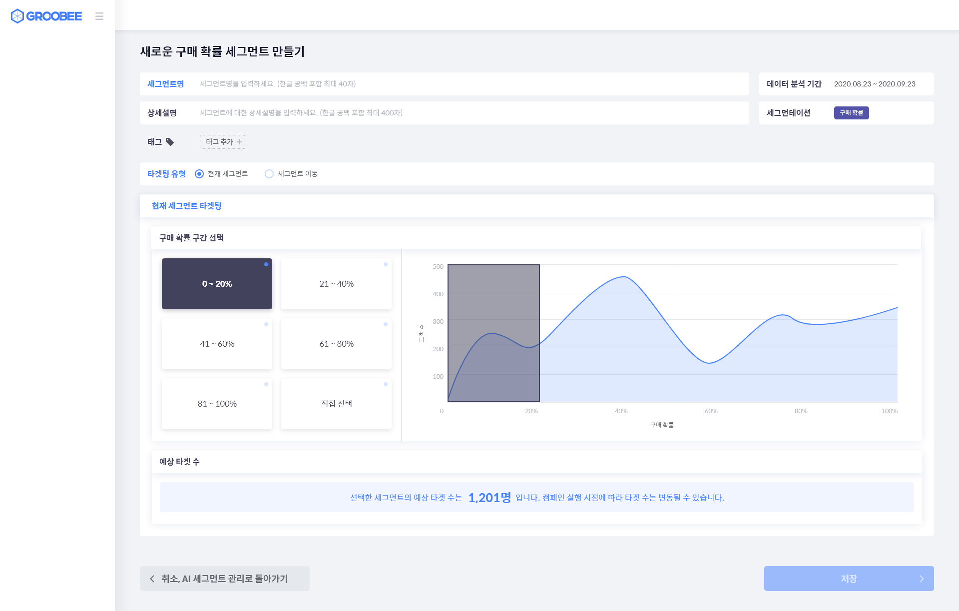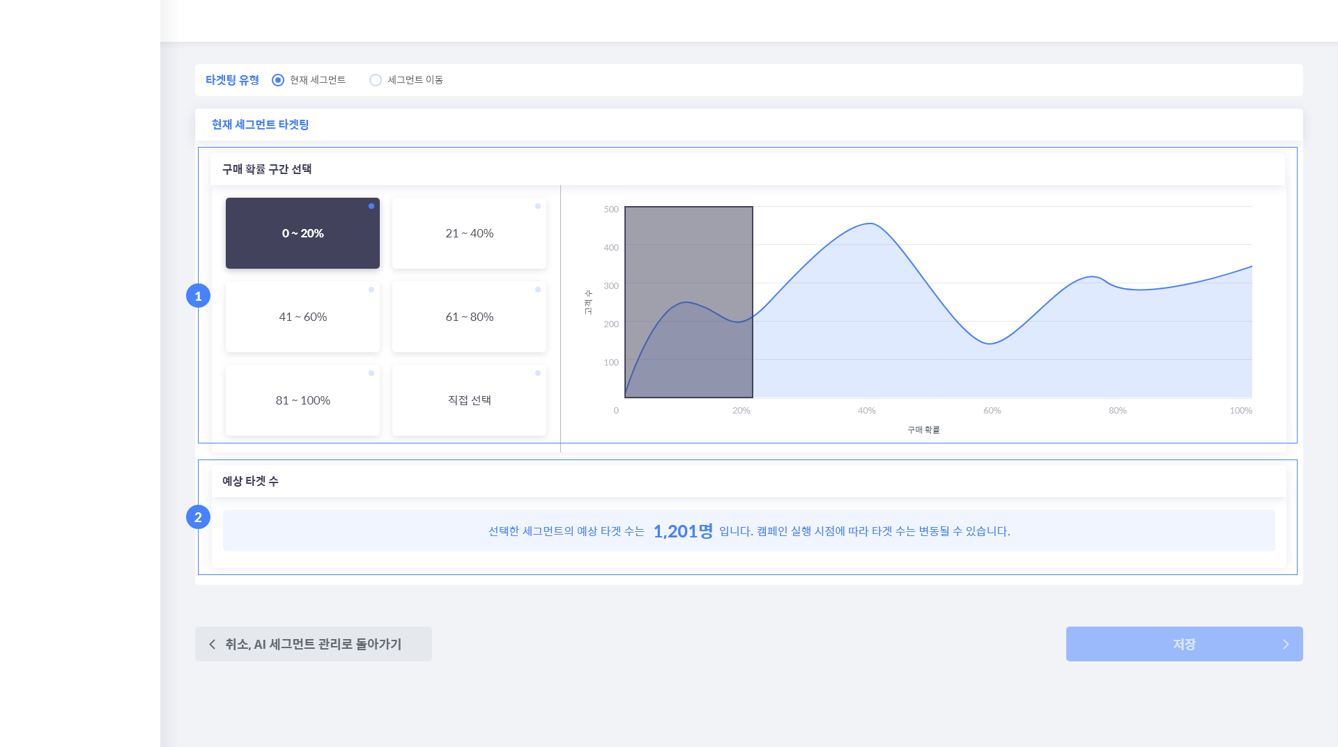 현재 세그먼트 : 특정 구매 확률 구간에 속한 고객을 타겟팅 할 수 있습니다.