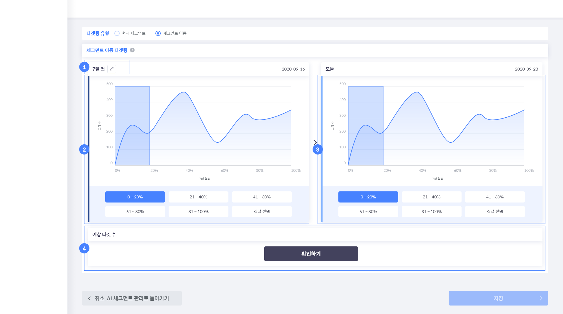 구간 선택 버튼을 활용하여 타겟팅 하고자 하는 세그먼트 구간을 선택할 수 있습니다.