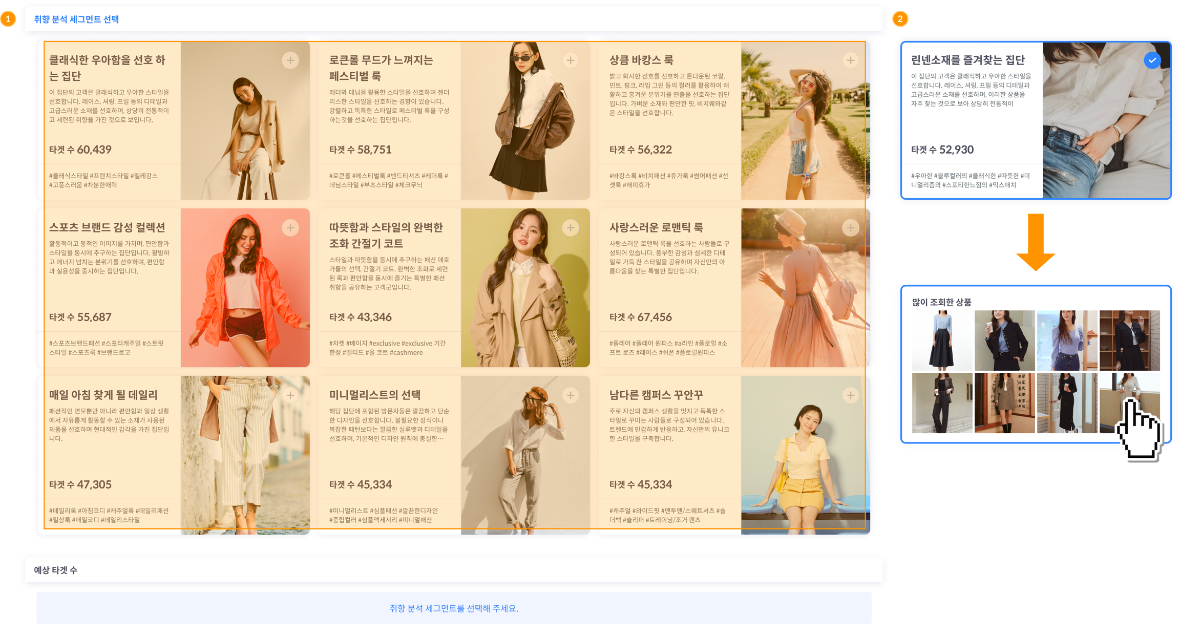세그먼트 리스트: 분석된 하나의 집단(세그먼테이션)을 선택할 수 있습니다. 최대 15개 집단(세그먼테이션)이 생성되어 선택할 수 있습니다. (카드 선택 시 예상 타겟 수를 확인하실 수 있습니다.)