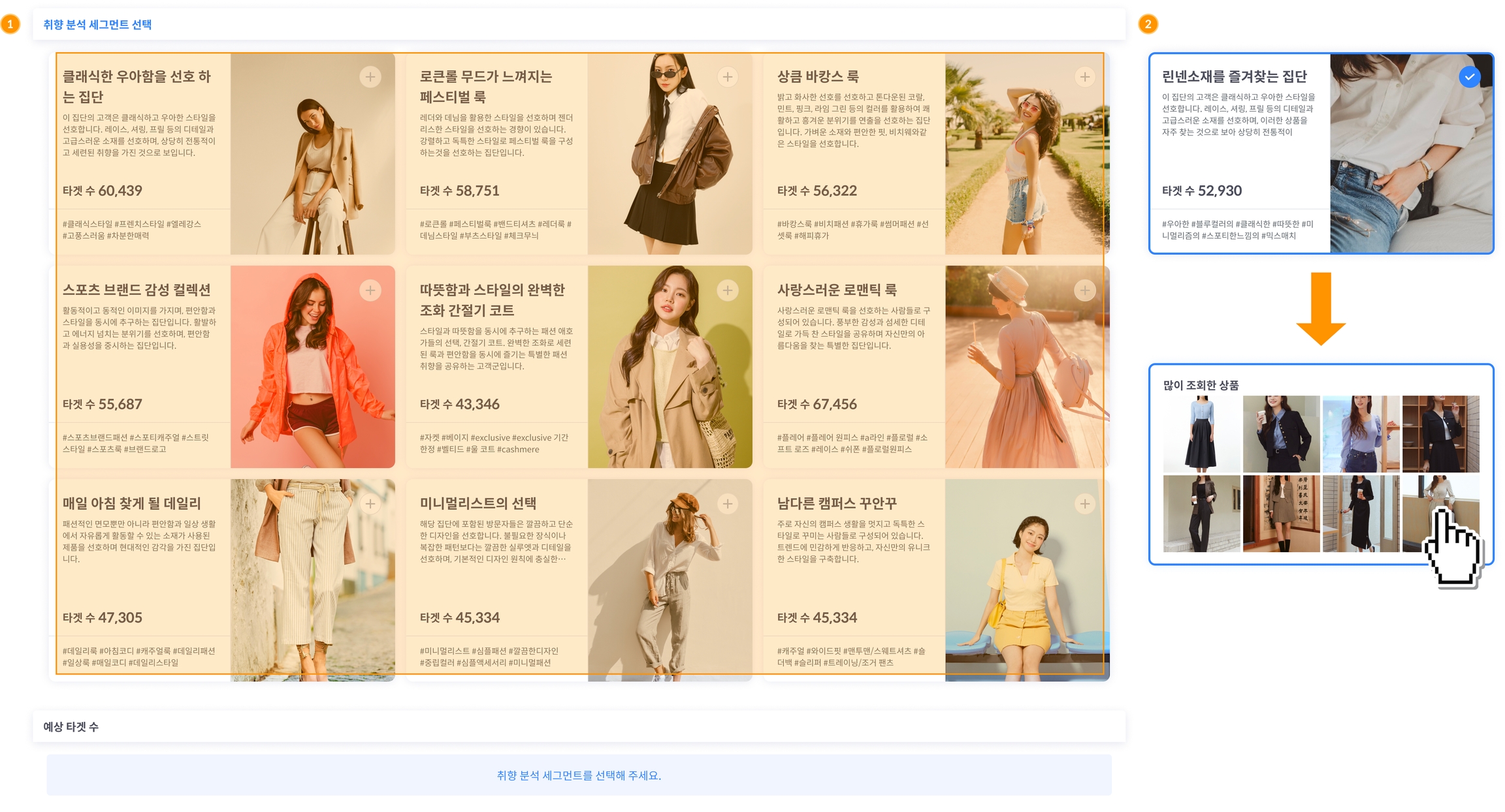 분석된 세그먼트는 하나의 카드 형태로 그룹핑되어 선택할 수 있습니다.