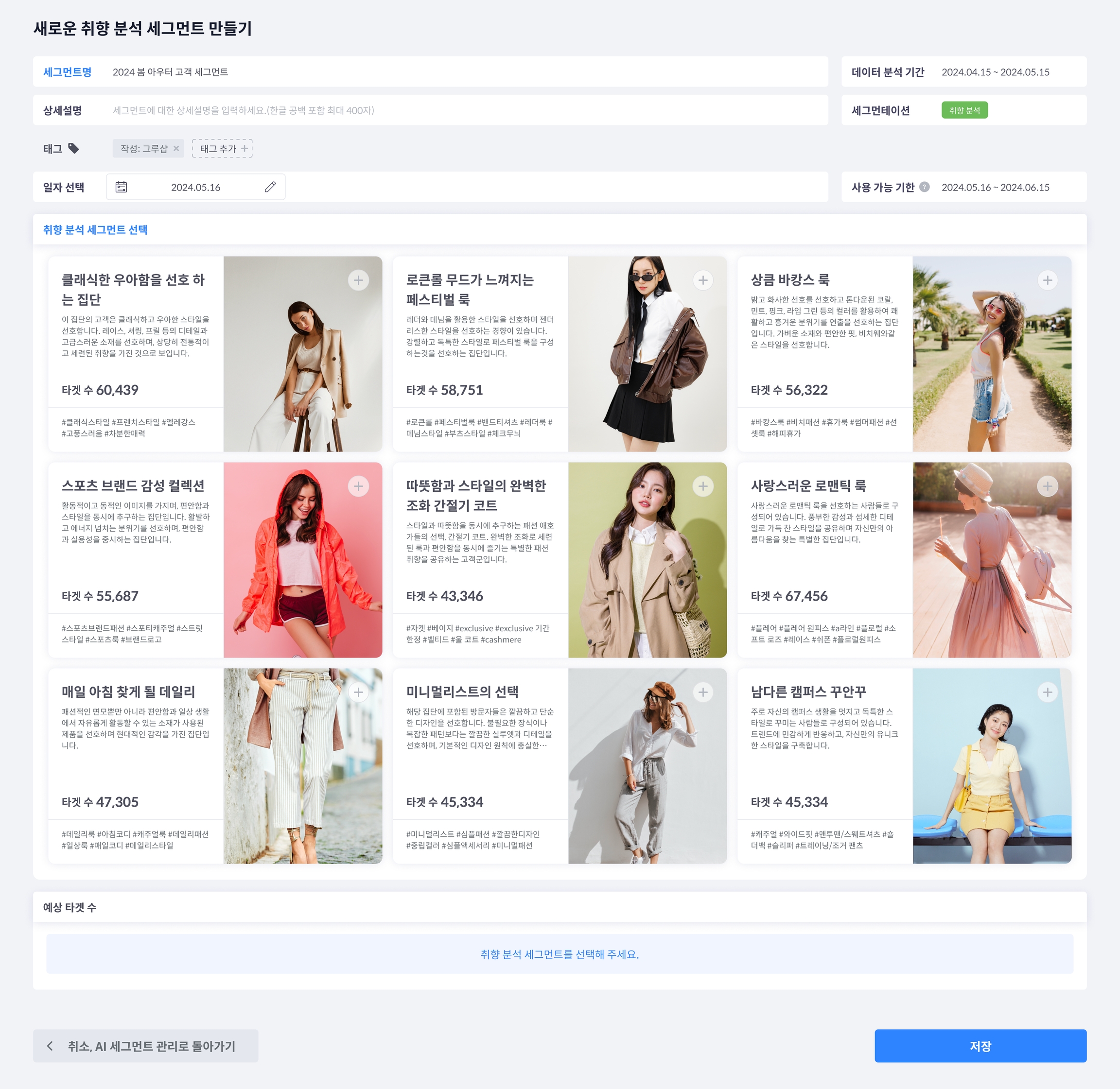 4. 태그: 태그를 지정하면 AI 세그먼트 관리 메뉴에서 태그 필터 기능으로 생성한 세그먼트를 분류하여 관리할 수 있습니다.