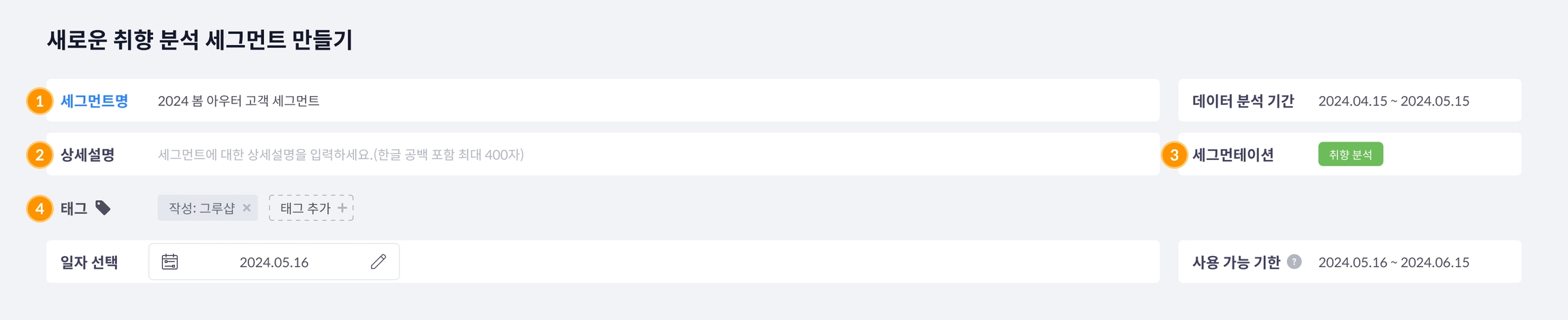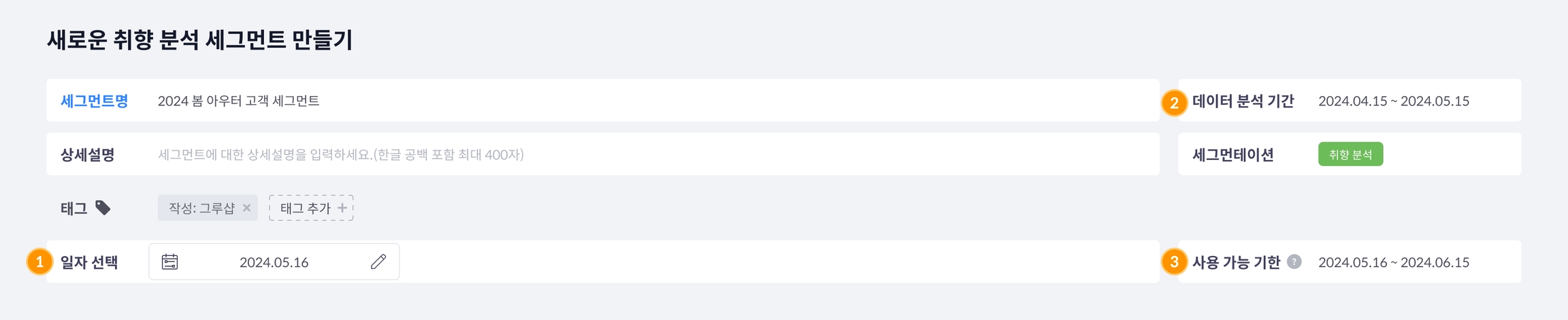 취향 분석 세그먼트는 선택한 일자에 따라 데이터 분석 기간과 세그먼트 사용 기한이 조정됩니다.
