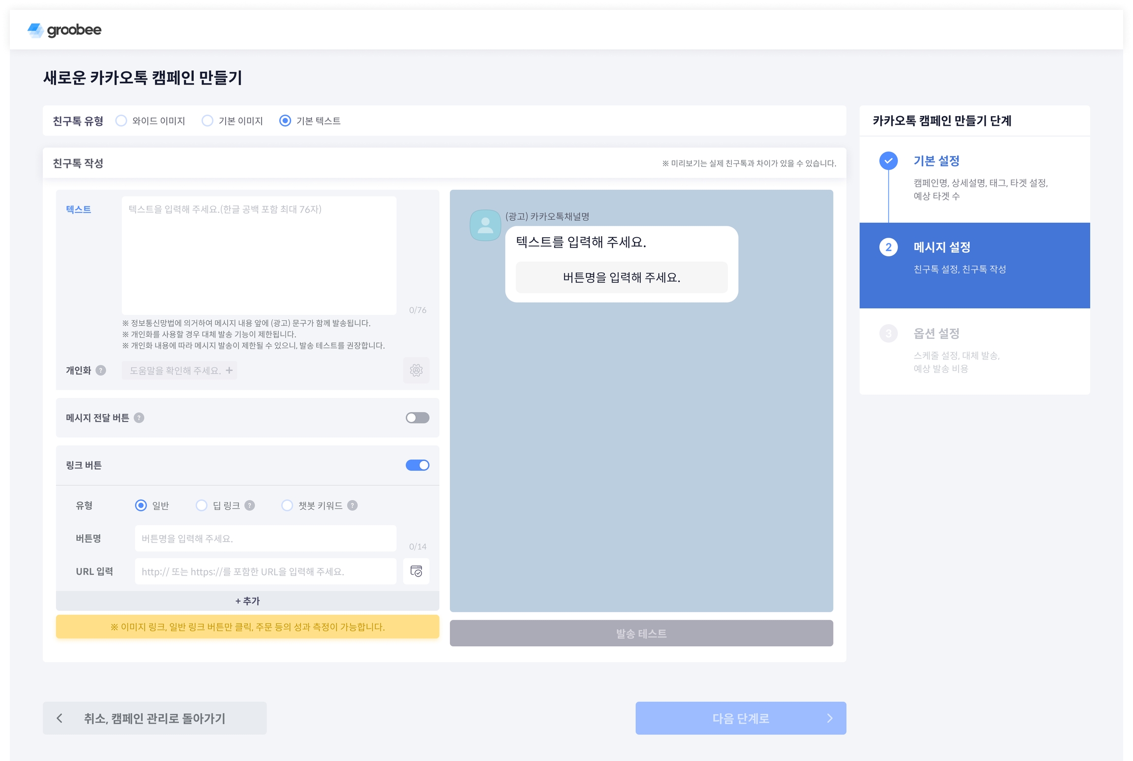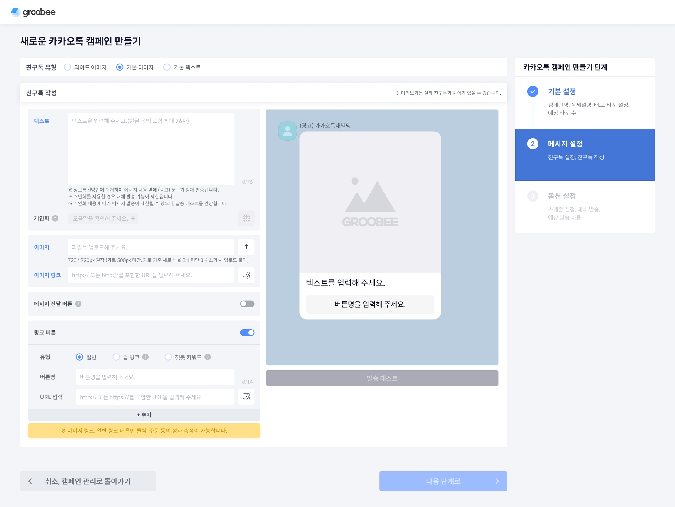 선택한 친구톡 유형에 따라 콘텐츠를 작성할 수 있습니다.