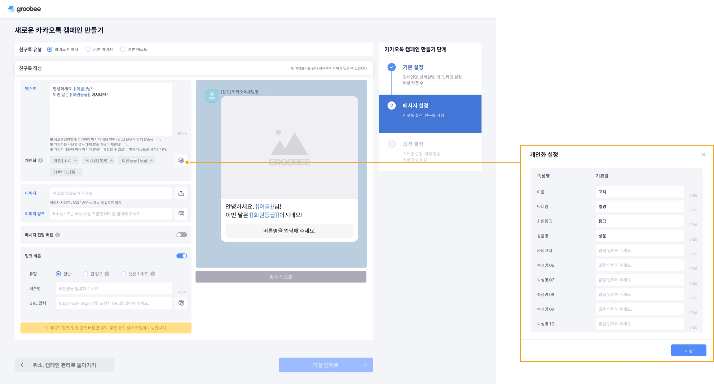 캠페인 만들기 1단계에서 개인화 정보를 업로드를 하셔야 개인화 설정을 하실 수 있습니다.