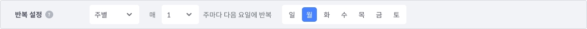 (2) 주별 반복 : 발송 기간동안 캠페인을 반복할 주 간격과 해당 주에 반복할 특정 요일을 설정할 수 있습니다. (요일 복수 선택 가능)