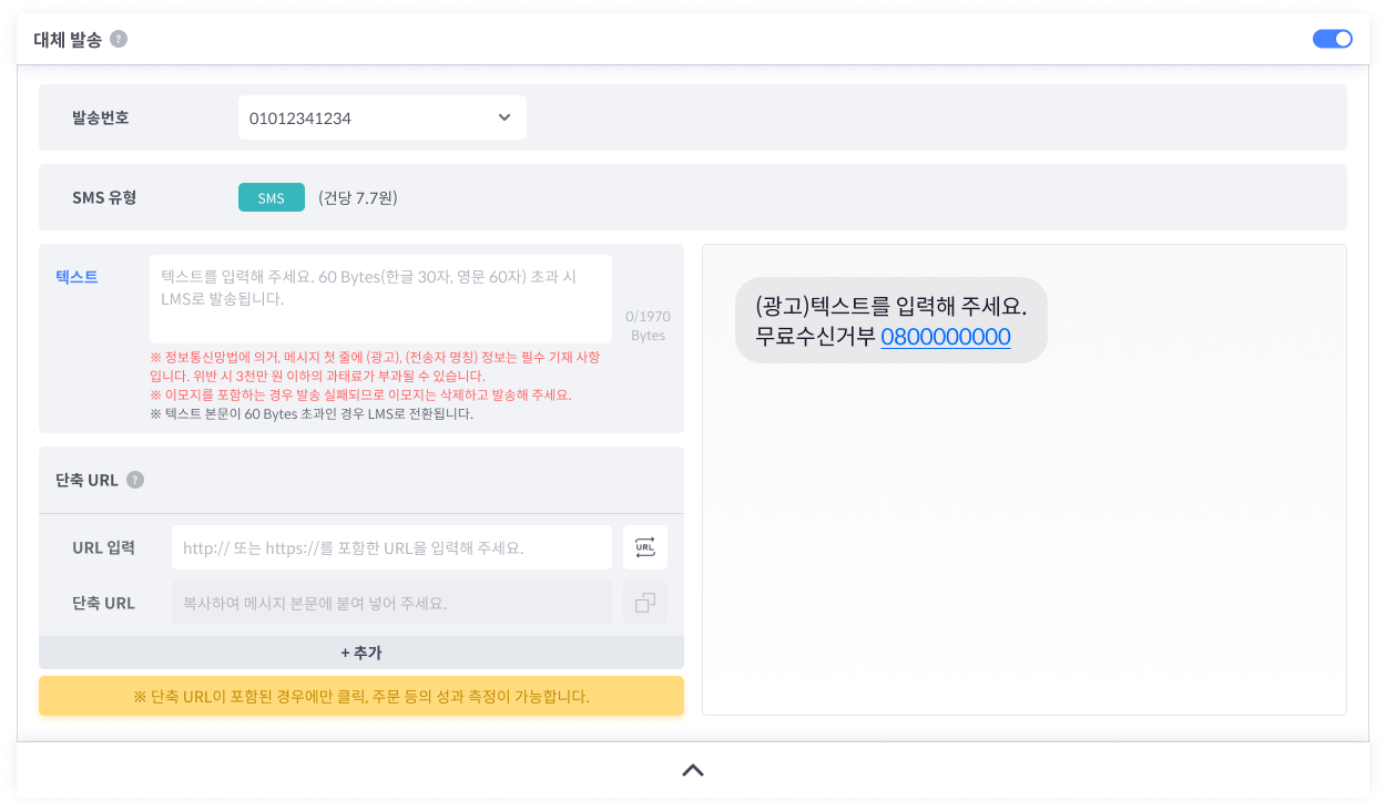 대체 발송 SMS의 클릭, 주문 성과를 추적을 위해서 단축 URL 사용을 권장합니다.