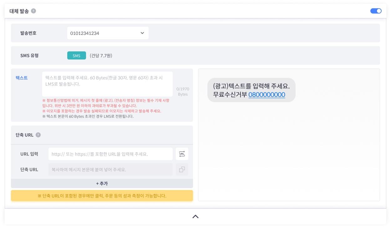 텍스트 본문이 60 Bytes 이하인 경우 SMS, 60 Bytes 초과인 경우 LMS로 전환됩니다. (광고, 무료수신거부 번호 포함하여 90 Bytes 기준)
