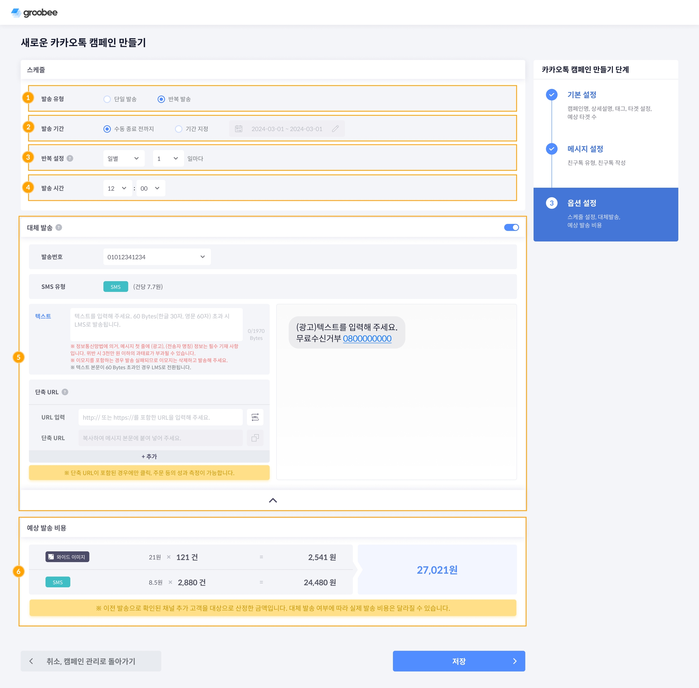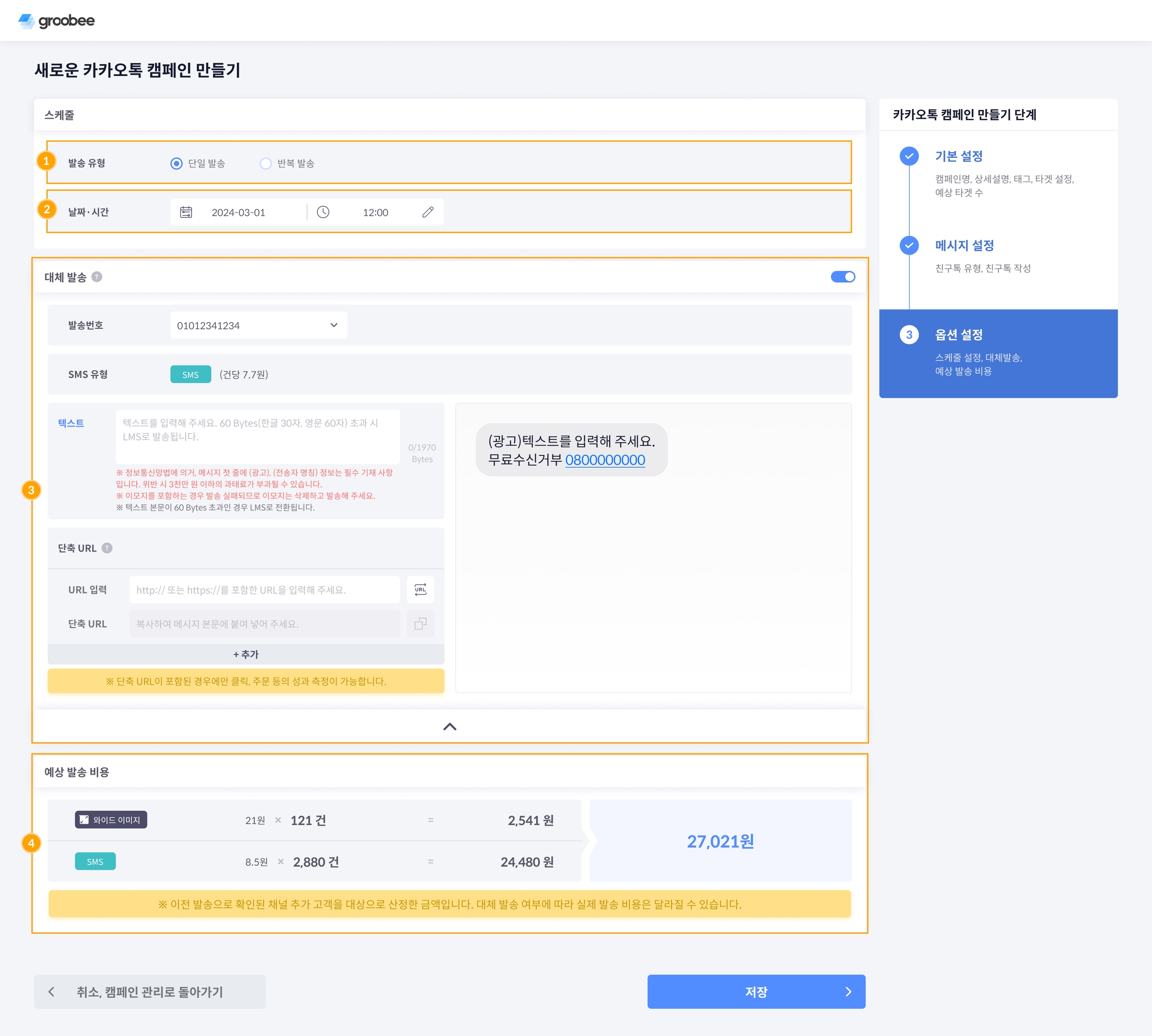 카카오톡 캠페인 만들기 3단계 옵션 설정