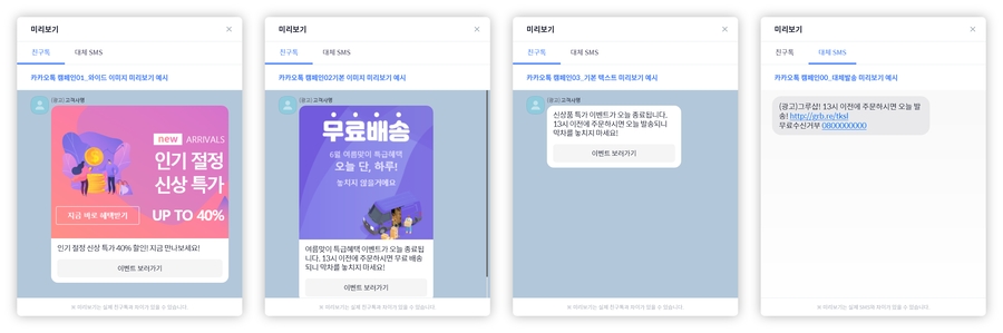 선택된 카카오톡 메시지를 미리보기 할 수 있습니다. 메시지 설정에서 작성한 기본 메시지, 펼친 메시지를 미리보기 할 수 있습니다.
