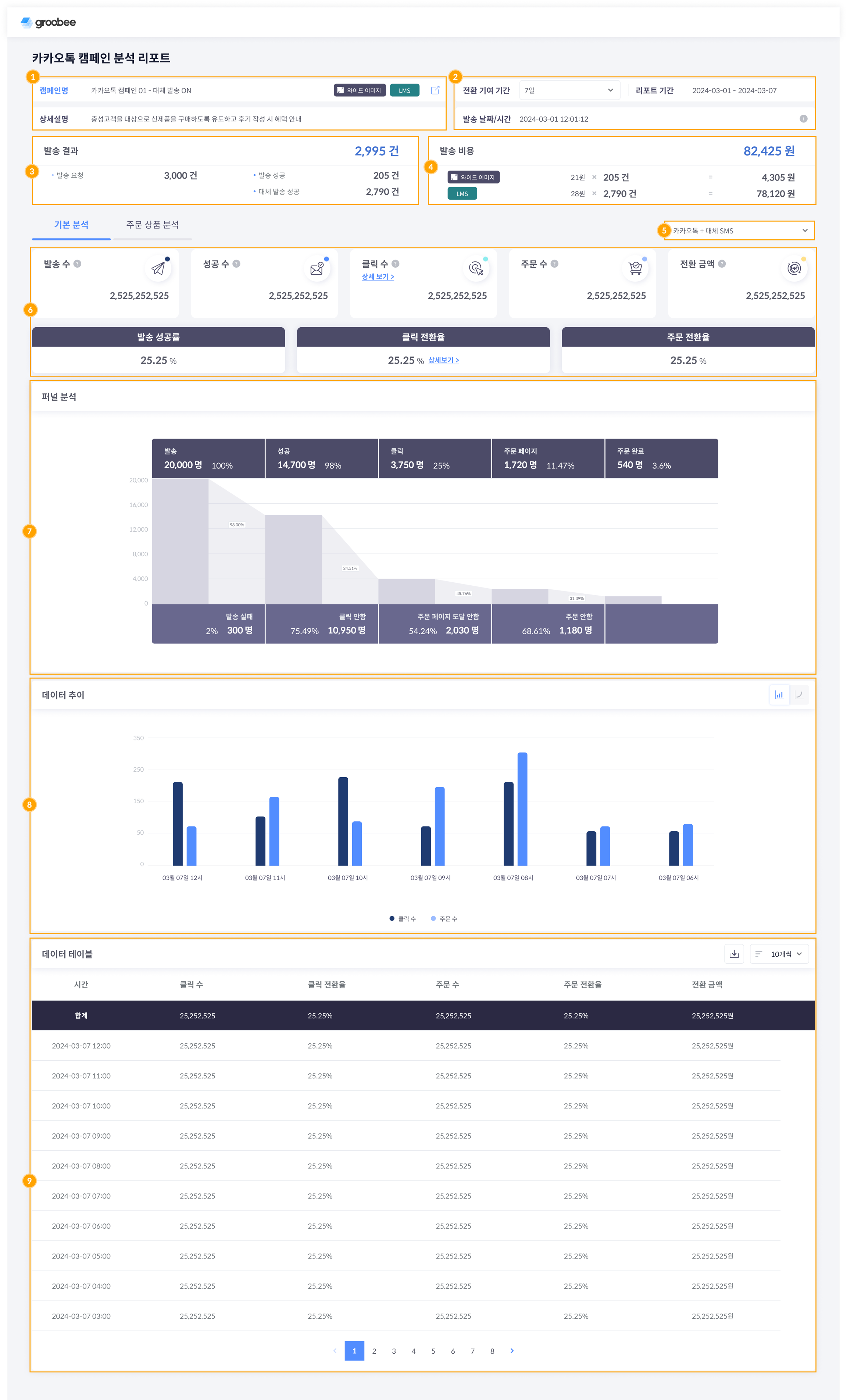 타겟팅 된 고객에게 캠페인을 발송, 수신부터 주문 전환에 이르기까지의 흐름을 시각화하고 단계별로 수치와 비중을 표시합니다.