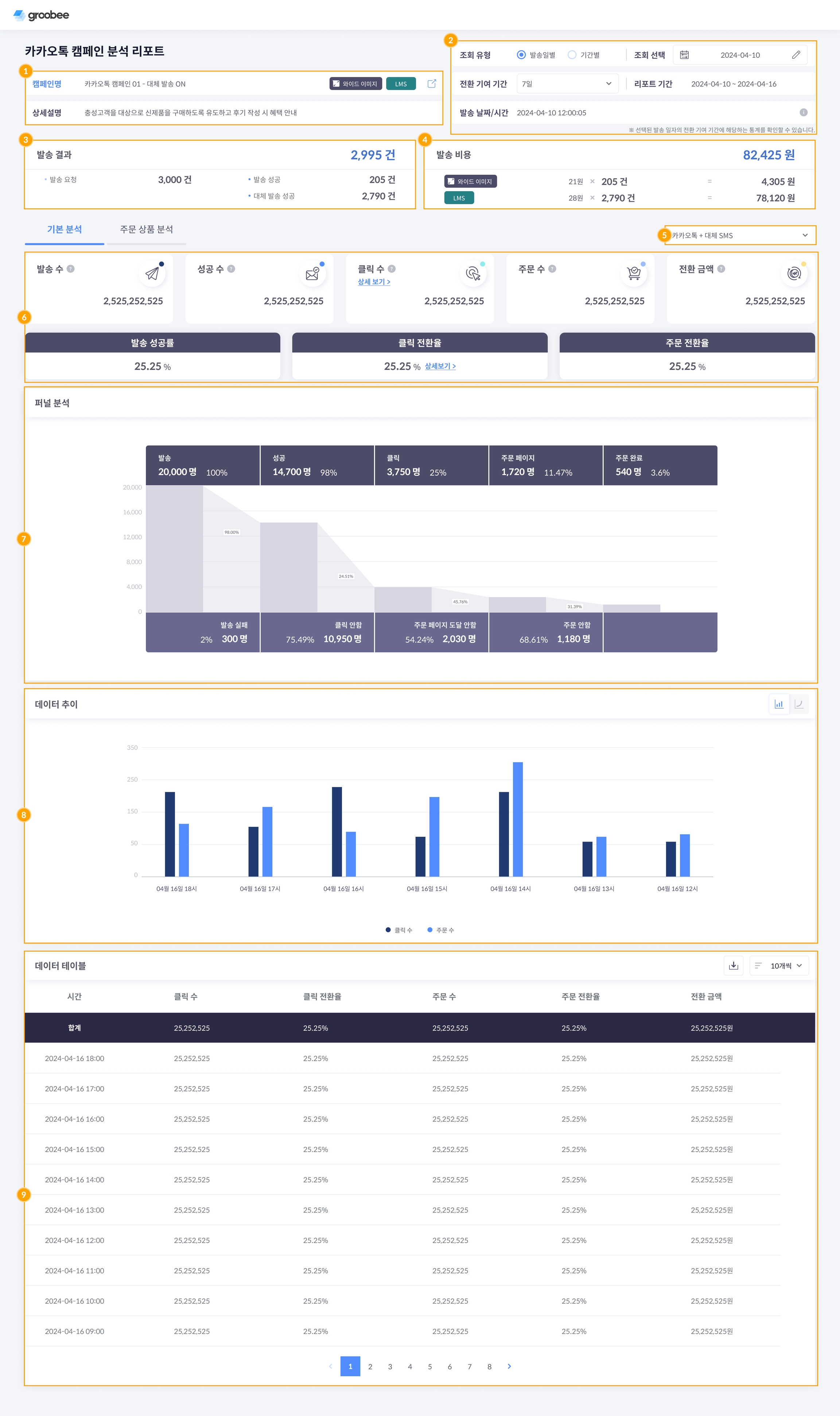 타겟팅 된 고객에게 캠페인을 발송, 수신부터 주문 전환에 이르기까지의 흐름을 시각화하고 단계별로 수치와 비중을 표시합니다.