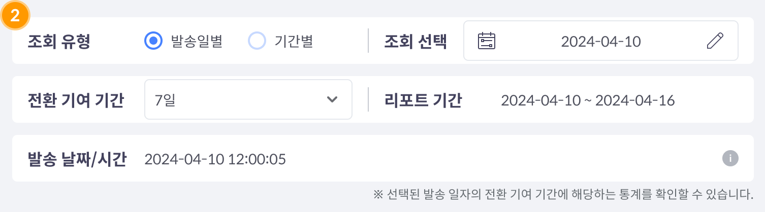 발송일별 : 발송이 진행된 일자를 선택하여 전환 기여 기간만큼의 통계 데이터를 확인할 수 있습니다.