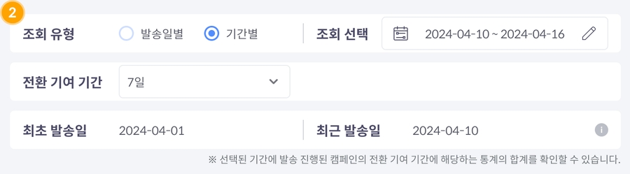 기간별 : 달력에서 기간을 선택하여 해당 기간 안에 발송된 캠페인들의 전환 기여 기간만큼의 통계 데이터 합계를 확인할 수 있습니다.