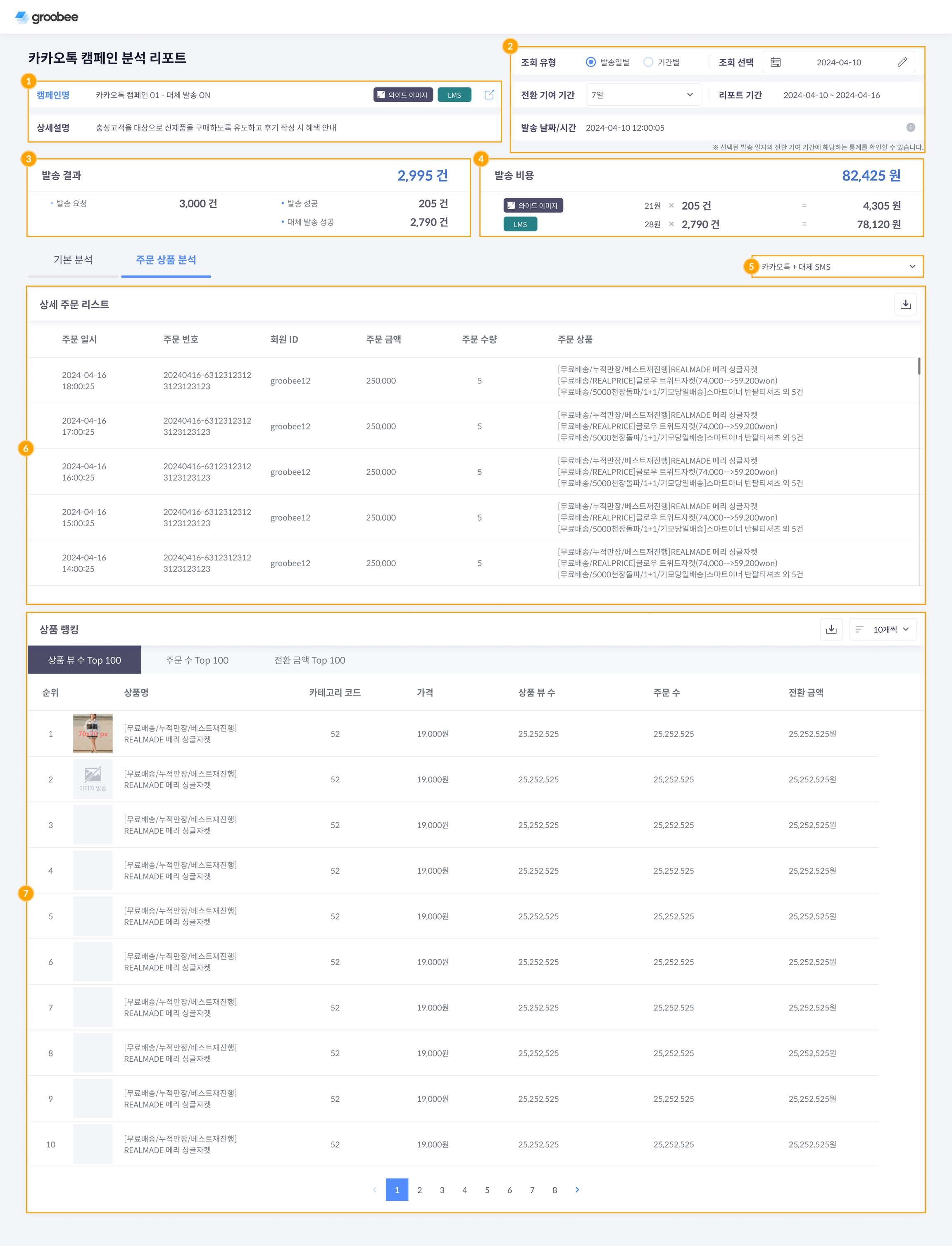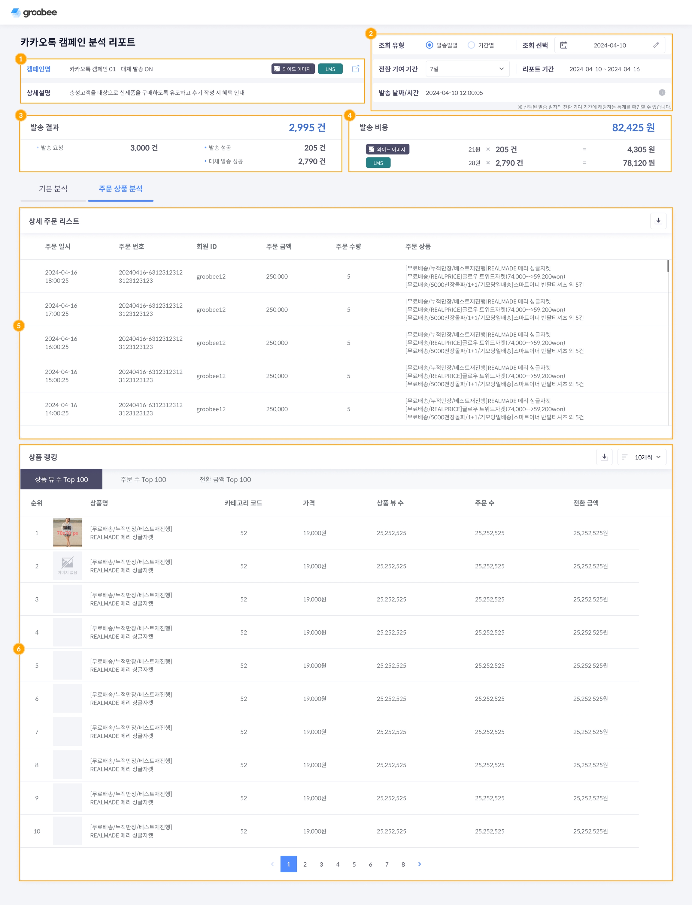 캠페인 분석 리포트의 주문 상품 분석을 통해 선택한 캠페인을 통한 주문 이력과 상품 랭킹을 확인할 수 있습니다.