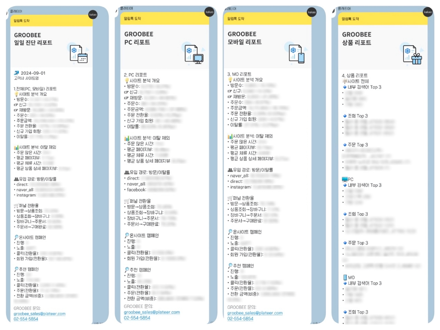 • 마케터라면 꼭 알아두면 좋을 사이트 현황 및 캠페인 분석 데이터를 카카오 알림톡을 이용해 마케팅 담당자에게 일 단위로 제공하는 분석 리포트입니다. 일일 진단 리포트는 전체, PC리포트, MO 리포트, 상품 리포트 등 총 4개로 이뤄져 있습니다.