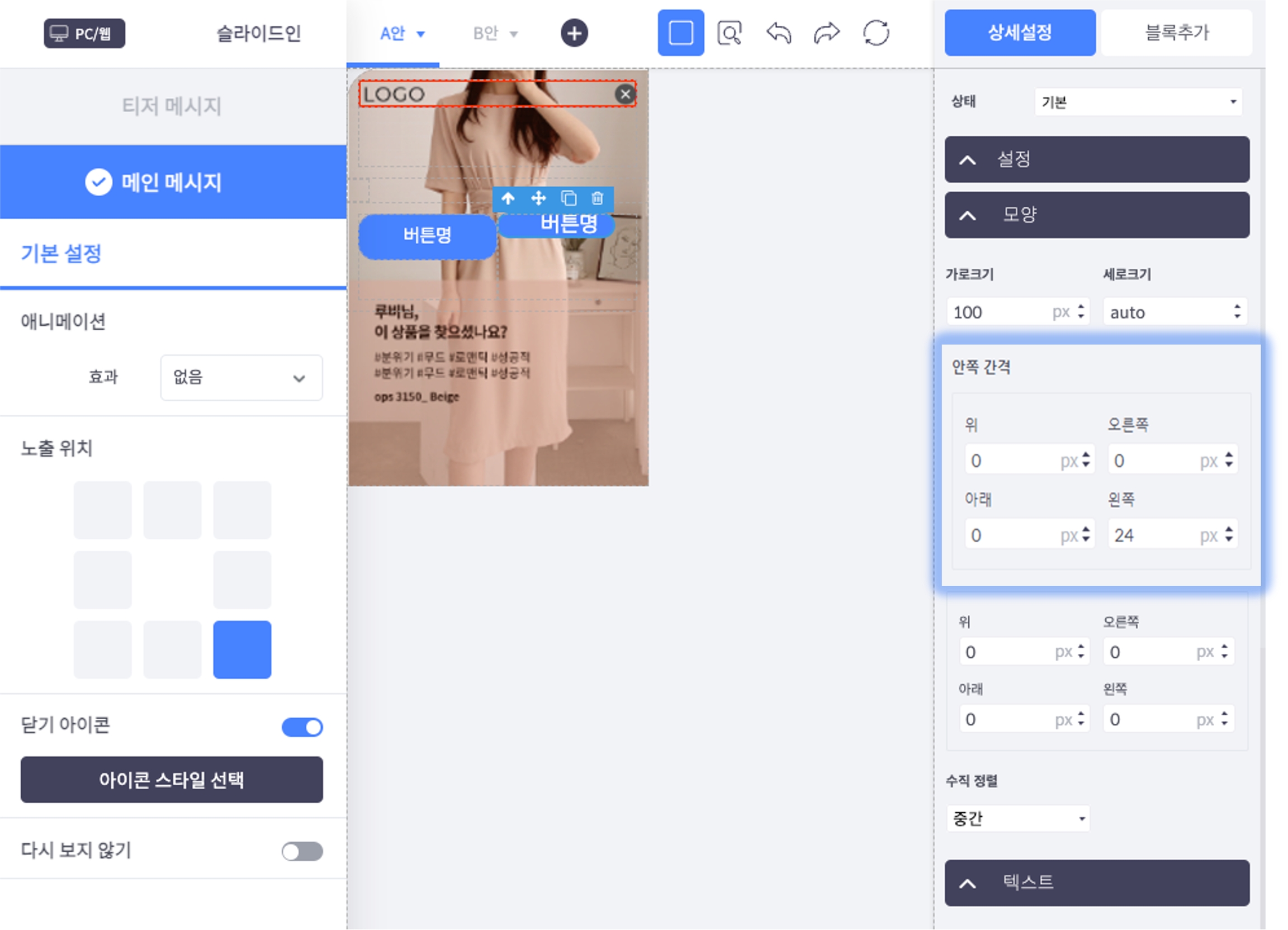 버튼 안의 간격 조정이 필요할 경우 추가된 버튼 블록을 클릭 후 '상세설정 > 모양 > 안쪽 간격'을 설정합니다.